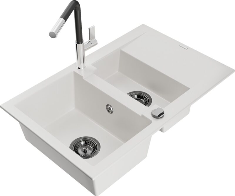 Technické dáta: drez: Rozmer: 737x475x177mm Hĺbka komory: 167 mm (väčšia), 107 mm (menšia) Rozmery komory: 395×272 mm (väčšie), (menšie) 375×182 mm Priemer odtoku: ø90 mm Typ: 1,5-miska s krátkym odkvapkávačom Typ: Zapustené do pracovnej dosky biela farba Povrchová úprava sifónu: čierna Materiál: žula (80% žulové kamenivo, 20% živice) Prepadový otvor: Áno Otvory: (batérie, automatické) 2 Inštalácia: Univerzálna, je možné inštalovať s odkvapkávačom na ľavú alebo pravú stranu Vysoká odolnosť proti poškriabaniu a zmene farby Odolnosť proti tepelným šokom Ľahko čistiteľný povrch kuchynská batéria: Materiál: mosadz Farba: chróm/čierna Hlava: Keramická Prevzdušňovač: Áno Typ: Jedna páka Rozsah výtoku: 245 mm Výška batérie: 307 mm(GT) Ean: 5905315058997