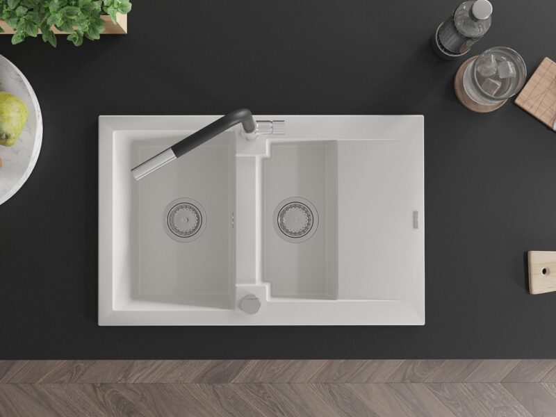 Technické dáta: drez: Rozmer: 737x475x177mm Hĺbka komory: 167 mm (väčšia), 107 mm (menšia) Rozmery komory: 395×272 mm (väčšie), (menšie) 375×182 mm Priemer odtoku: ø90 mm Typ: 1,5-miska s krátkym odkvapkávačom Typ: Zapustené do pracovnej dosky biela farba Povrchová úprava sifónu: Chrome Materiál: žula (80% žulové kamenivo, 20% živice) Prepadový otvor: Áno Otvory: (batérie, automatické) 2 Inštalácia: Univerzálna, je možné inštalovať s odkvapkávačom na ľavú alebo pravú stranu Vysoká odolnosť proti poškriabaniu a zmene farby Odolnosť proti tepelným šokom Ľahko čistiteľný povrch kuchynská batéria: Materiál: mosadz Farba: chróm/čierna Hlava: Keramická Prevzdušňovač: Áno Typ: Jedna páka Rozsah výtoku: 245 mm Výška batérie: 307 mm(GT) Ean: 5905315058980