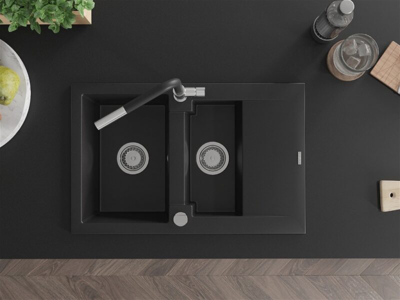 Technické dáta: drez: Rozmer: 737x475x177mm Hĺbka komory: 167 mm (väčšia), 107 mm (menšia) Rozmery komory: 395×272 mm (väčšie), (menšie) 375×182 mm Priemer odtoku: ø90 mm Typ: 1,5-komorový s krátkym odkvapkávačom Typ: Zapustené do pracovnej dosky Čierna farba Povrchová úprava sifónu: Chrome Materiál: žula (80% žulové kamenivo, 20% živice) Prepadový otvor: Áno Otvory: (batérie, automatické) 2 Inštalácia: Univerzálna, je možné inštalovať s odkvapkávačom na ľavú alebo pravú stranu Vysoká odolnosť proti poškriabaniu a zmene farby Odolnosť proti tepelným šokom Ľahko čistiteľný povrch kuchynská batéria: Materiál: mosadz Farba: chróm/čierna Hlava: Keramická Prevzdušňovač: Áno Typ: Jedna páka Rozsah výtoku: 245 mm Výška batérie: 307 mm(GT) Ean: 5905315059406