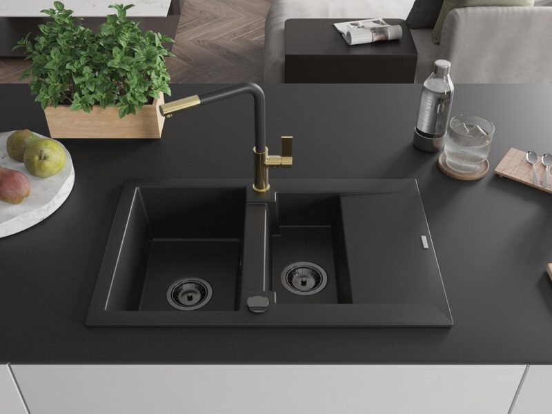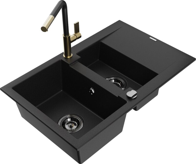 Technické dáta: drez: Rozmer: 737x475x177mm Hĺbka komory: 167 mm (väčšia), 107 mm (menšia) Rozmery komory: 395×272 mm (väčšie), (menšie) 375×182 mm Priemer odtoku: ø90 mm Typ: 1,5-komorový s krátkym odkvapkávačom Typ: Zapustené do pracovnej dosky Čierna farba Povrchová úprava sifónu: čierna Materiál: žula (80% žulové kamenivo, 20% živice) Prepadový otvor: Áno Otvory: (batérie, automatické) 2 Inštalácia: Univerzálna, je možné inštalovať s odkvapkávačom na ľavú alebo pravú stranu Vysoká odolnosť proti poškriabaniu a zmene farby Odolnosť proti tepelným šokom Ľahko čistiteľný povrch kuchynská batéria: Materiál: mosadz Farba: Zlatá/Čierna Hlava: Keramická Prevzdušňovač: Áno Typ: Jedna páka Rozsah výtoku: 245 mm Výška batérie: 307 mm(GT) Ean: 5905315059437