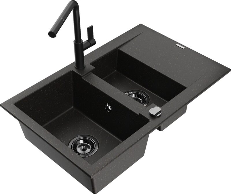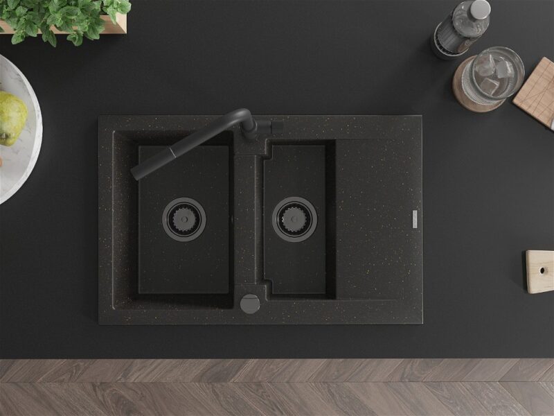 Technické dáta: drez: Rozmer: 737x475x177mm Hĺbka komory: 167 mm (väčšia), 107 mm (menšia) Rozmery komory: 395×272 mm (väčšie), (menšie) 375×182 mm Priemer odtoku: ø90 mm Typ: 1,5-komorový s krátkym odkvapkávačom Typ: Zapustené do pracovnej dosky Farba: čierna / zlatá metalíza Povrchová úprava sifónu: čierna Materiál: žula (80% žulové kamenivo, 20% živice) Prepadový otvor: Áno Otvory: (batérie, automatické) 2 Inštalácia: Univerzálna, je možné inštalovať s odkvapkávačom na ľavú alebo pravú stranu Vysoká odolnosť proti poškriabaniu a zmene farby Odolnosť proti tepelným šokom Ľahko čistiteľný povrch kuchynská batéria: Materiál: mosadz Čierna farba Hlava: Keramická Prevzdušňovač: Áno Typ: Jedna páka Rozsah výtoku: 245 mm Výška batérie: 307 mm(GT) Ean: 5905315059284