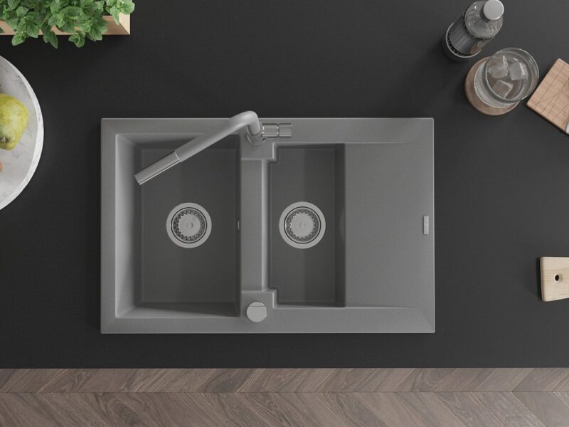 Technické dáta: Drez: Rozmer: 737x475x177 mm Hĺbka komory: 167 mm (väčšia), 107 mm (menšia) Rozmery komory: 395×272 mm (väčšie), (menšie) 375×182 mm Priemer odtoku: ø90 mm Typ: 1,5-miska s krátkym odkvapkávačom Typ: Zapustené do pracovnej dosky Šedá farba Povrchová úprava sifónu: Chrome Materiál: žula (80% žulové kamenivo 20% živice) Prepadový otvor: Áno Otvory: (batérie, automat) 2 Inštalácia: Univerzálna, je možné inštalovať s odkvapkávačom na ľavú alebo pravú stranu Vysoká odolnosť proti poškriabaniu a zmene farby Odolnosť proti tepelným šokom Povrch pre ľahké čistenie Kuchynská batéria: Materiál: mosadz Farba: chróm/sivá Hlava: Keramická Perlátor: Áno Typ: Jednopáková Rozsah výtoku: 245 mm Výška batérie: 307 mm(GT) Ean: 5905315059116