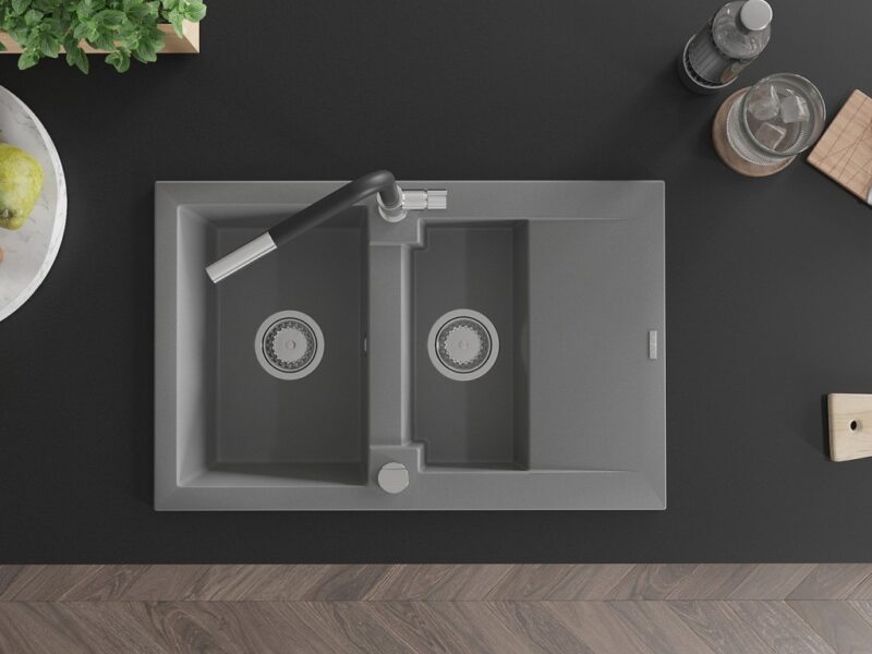 Technické dáta: Drez: Rozmer: 737x475x177 mm Hĺbka komory: 167 mm (väčšia), 107 mm (menšia) Rozmery komory: 395×272 mm (väčšie), (menšie) 375×182 mm Priemer odtoku: ø90 mm Typ: 1,5-miska s krátkym odkvapkávačom Typ: Zapustené do pracovnej dosky Šedá farba Povrchová úprava sifónu: Chrome Materiál: žula (80% žulové kamenivo 20% živice) Prepadový otvor: Áno Otvory: (batérie, automat) 2 Inštalácia: Univerzálna, je možné inštalovať s odkvapkávačom na ľavú alebo pravú stranu Vysoká odolnosť proti poškriabaniu a zmene farby Odolnosť proti tepelným šokom Povrch pre ľahké čistenie Kuchynská batéria: Materiál: mosadz Farba: chróm/čierna Hlava: Keramická Perlátor: Áno Typ: Jednopákové Rozsah výtoku: 245 mm Výška batérie: 307 mm(GT) Ean: 5905315059123