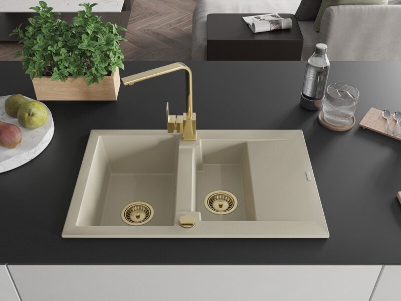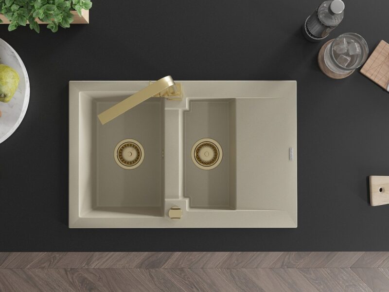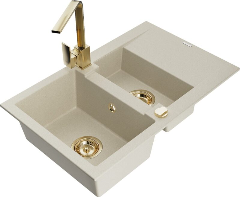 Technické dáta: Drez: Rozmer: 737x475x177 mm Hĺbka komory: 167 mm (väčšia), 107 mm (menšia) Rozmery komory: 395×272 mm (väčšie), (menšie) 375×182 mm Priemer odtoku: ø90 mm Typ: 1,5-miska s krátkym odkvapkávačom Typ: Zapustené do pracovnej dosky Farba béžová Povrchová úprava sifónu: zlatá Materiál: žula (80% žulové kamenivo 20% živice) Prepadový otvor: Áno Otvory: (batérie, automat) 2 Inštalácia: Univerzálna, je možné inštalovať s odkvapkávačom na ľavú alebo pravú stranu Vysoká odolnosť proti poškriabaniu a zmene farby Odolnosť proti tepelným šokom Povrch pre ľahké čistenie Kuchynská batéria: Materiál: mosadz Farba: Zlatá Hlava: Keramická Perlátor: Áno Typ: Jednopákové Výška batérie: 290 mm Rozsah výtoku: 220 mm(GT) Ean: 5905315018878