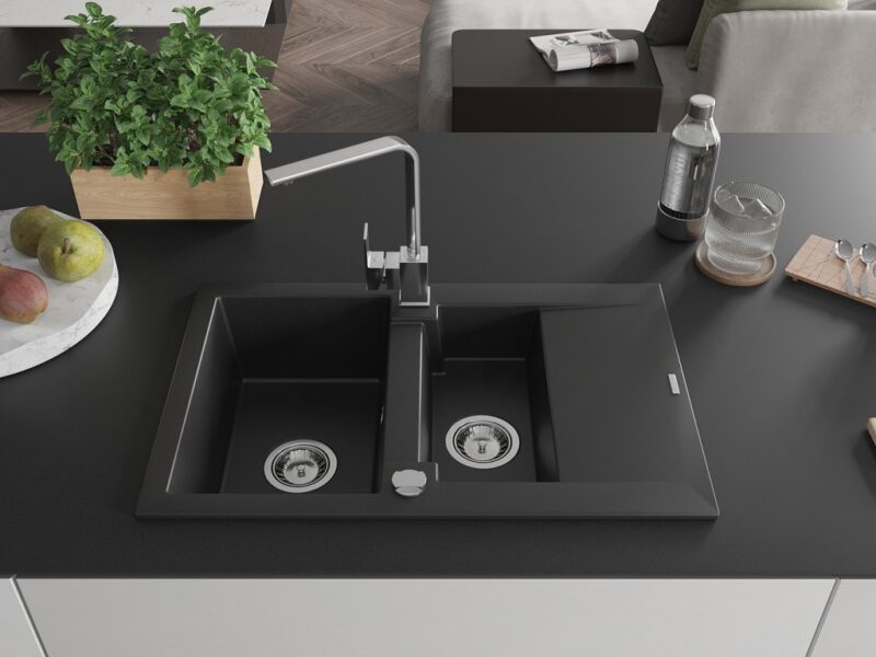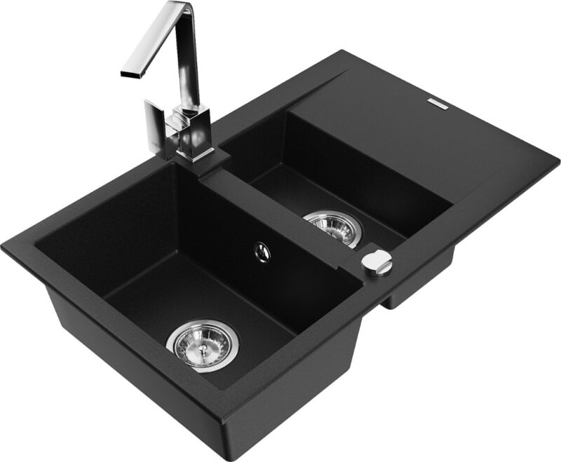 Technické dáta: drez: Rozmer: 737x475x177mm Hĺbka komory: 167 mm (väčšia), 107 mm (menšia) Rozmery komory: 395×272 mm (väčšie), (menšie) 375×182 mm Priemer odtoku: ø90 mm Typ: 1,5-komorový s krátkym odkvapkávačom Typ: Zapustené do pracovnej dosky Čierna farba Povrchová úprava sifónu: Chrome Materiál: žula (80% žulové kamenivo, 20% živice) Prepadový otvor: Áno Otvory: (batérie, automatické) 2 Inštalácia: Univerzálna, je možné inštalovať s odkvapkávačom na ľavú alebo pravú stranu Vysoká odolnosť proti poškriabaniu a zmene farby Odolnosť proti tepelným šokom Ľahko čistiteľný povrch kuchynská batéria: Materiál: mosadz Farba: Chrome Hlava: Keramická Prevzdušňovač: Áno Typ: Jedna páka Výška batérie: 290 mm Rozsah výtoku: 220 mm(GT) Ean: 5905315019080