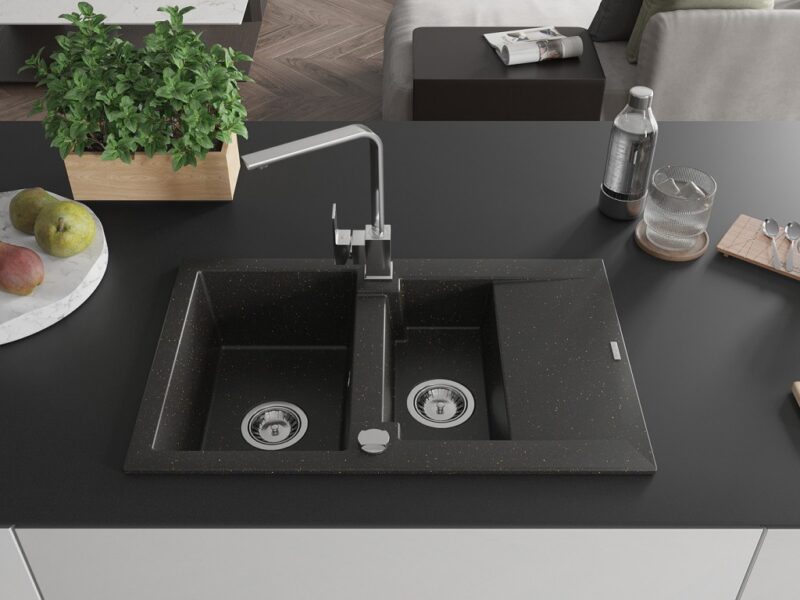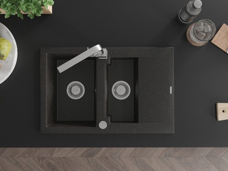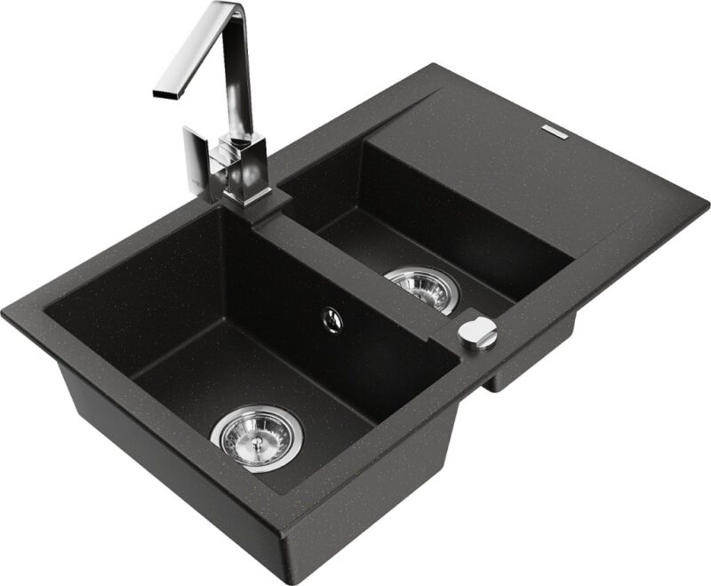 Technické dáta: drez: Rozmer: 737x475x177mm Hĺbka komory: 167 mm (väčšia), 107 mm (menšia) Rozmery komory: 395×272 mm (väčšie), (menšie) 375×182 mm Priemer odtoku: ø90 mm Typ: 1,5-komorový s krátkym odkvapkávačom Typ: Zapustené do pracovnej dosky Farba: čierna / zlatá metalíza Povrchová úprava sifónu: Chrome Materiál: žula (80% žulové kamenivo, 20% živice) Prepadový otvor: Áno Otvory: (batérie, automatické) 2 Inštalácia: Univerzálna, je možné inštalovať s odkvapkávačom na ľavú alebo pravú stranu Vysoká odolnosť proti poškriabaniu a zmene farby Odolnosť proti tepelným šokom Ľahko čistiteľný povrch kuchynská batéria: Materiál: mosadz Farba: Chrome Hlava: Keramická Prevzdušňovač: Áno Typ: Jedna páka Výška batérie: 290 mm Rozsah výtoku: 220 mm(GT) Ean: 5905315018984
