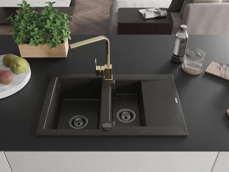MEXEN/S MEXEN/S – Gaspar granitový drez 1.5 s odkvapkávačom vrátane batérie Rita, čierny/zlatý 6507-75-670300-50-B