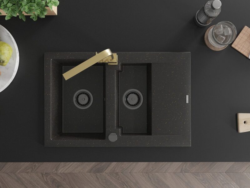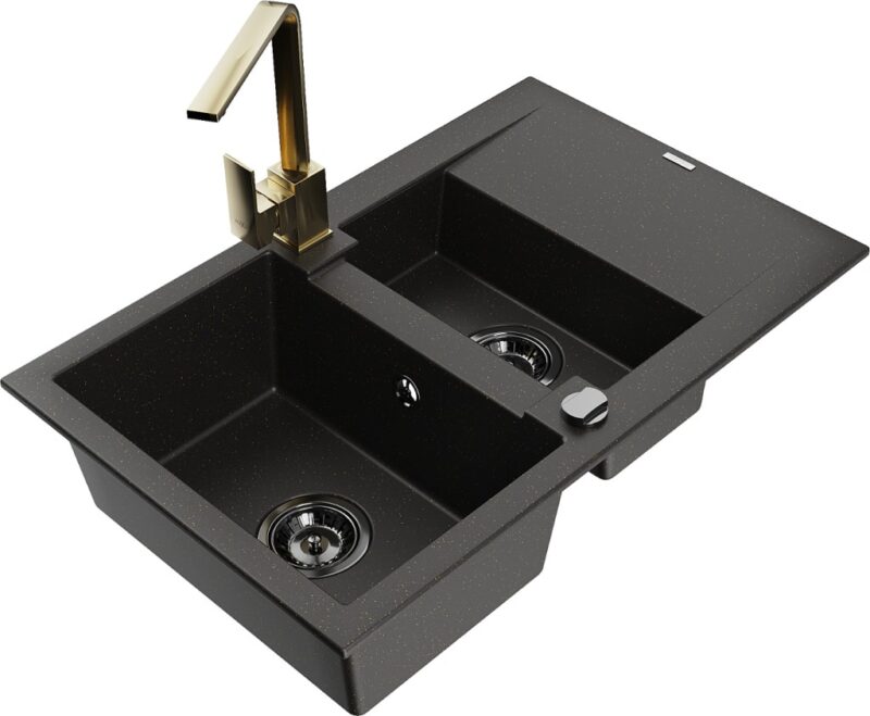 Technické dáta: drez: Rozmer: 737x475x177mm Hĺbka komory: 167 mm (väčšia), 107 mm (menšia) Rozmery komory: 395×272 mm (väčšie), (menšie) 375×182 mm Priemer odtoku: ø90 mm Typ: 1,5-komorový s krátkym odkvapkávačom Typ: Zapustené do pracovnej dosky Farba: čierna / zlatá metalíza Povrchová úprava sifónu: čierna Materiál: žula (80% žulové kamenivo, 20% živice) Prepadový otvor: Áno Otvory: (batérie, automatické) 2 Inštalácia: Univerzálna, je možné inštalovať s odkvapkávačom na ľavú alebo pravú stranu Vysoká odolnosť proti poškriabaniu a zmene farby Odolnosť proti tepelným šokom Ľahko čistiteľný povrch kuchynská batéria: Materiál: mosadz Farba: Zlatá Hlava: Keramická Prevzdušňovač: Áno Typ: Jedna páka Výška batérie: 290 mm Rozsah výtoku: 220 mm(GT) Ean: 5905315019004