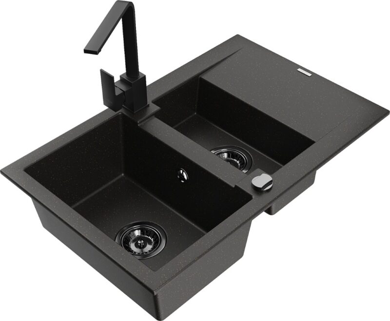 Technické dáta: drez: Rozmer: 737x475x177mm Hĺbka komory: 167 mm (väčšia), 107 mm (menšia) Rozmery komory: 395×272 mm (väčšie), (menšie) 375×182 mm Priemer odtoku: ø90 mm Typ: 1,5-komorový s krátkym odkvapkávačom Typ: Zapustené do pracovnej dosky Farba: čierna / zlatá metalíza Povrchová úprava sifónu: čierna Materiál: žula (80% žulové kamenivo, 20% živice) Prepadový otvor: Áno Otvory: (batérie, automatické) 2 Inštalácia: Univerzálna, je možné inštalovať s odkvapkávačom na ľavú alebo pravú stranu Vysoká odolnosť proti poškriabaniu a zmene farby Odolnosť proti tepelným šokom Ľahko čistiteľný povrch kuchynská batéria: Materiál: mosadz Čierna farba Hlava: Keramická Prevzdušňovač: Áno Typ: Jedna páka Výška batérie: 290 mm Rozsah výtoku: 220 mm(GT) Ean: 5905315019028