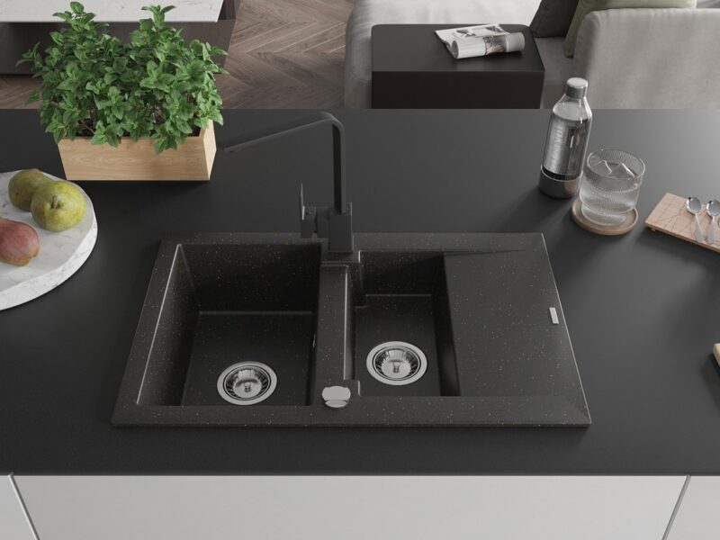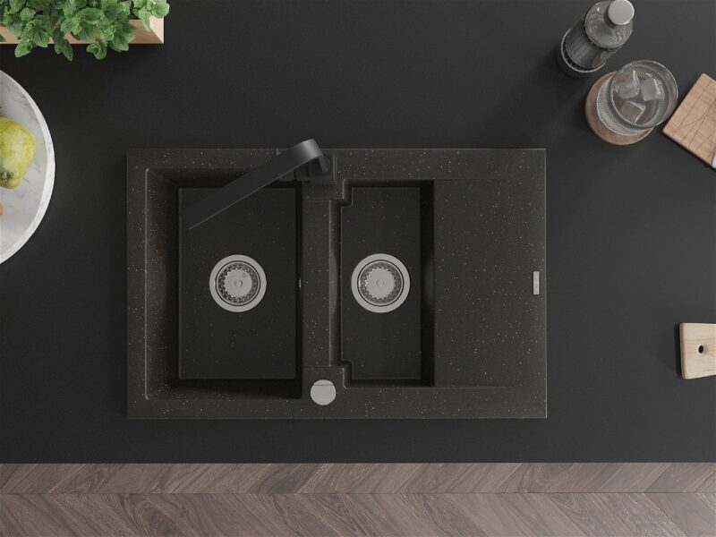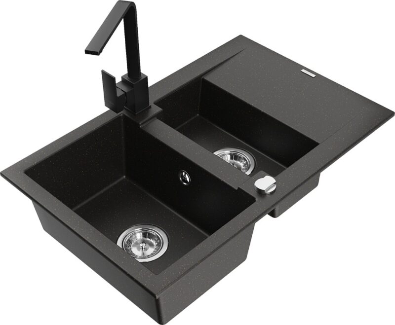 Technické dáta: drez: Rozmer: 737x475x177mm Hĺbka komory: 167 mm (väčšia), 107 mm (menšia) Rozmery komory: 395×272 mm (väčšie), (menšie) 375×182 mm Priemer odtoku: ø90 mm Typ: 1,5-komorový s krátkym odkvapkávačom Typ: Zapustené do pracovnej dosky Farba: čierna / zlatá metalíza Povrchová úprava sifónu: Chrome Materiál: žula (80% žulové kamenivo, 20% živice) Prepadový otvor: Áno Otvory: (batérie, automatické) 2 Inštalácia: Univerzálna, je možné inštalovať s odkvapkávačom na ľavú alebo pravú stranu Vysoká odolnosť proti poškriabaniu a zmene farby Odolnosť proti tepelným šokom Ľahko čistiteľný povrch kuchynská batéria: Materiál: mosadz Čierna farba Hlava: Keramická Prevzdušňovač: Áno Typ: Jedna páka Výška batérie: 290 mm Rozsah výtoku: 220 mm(GT) Ean: 5905315019011