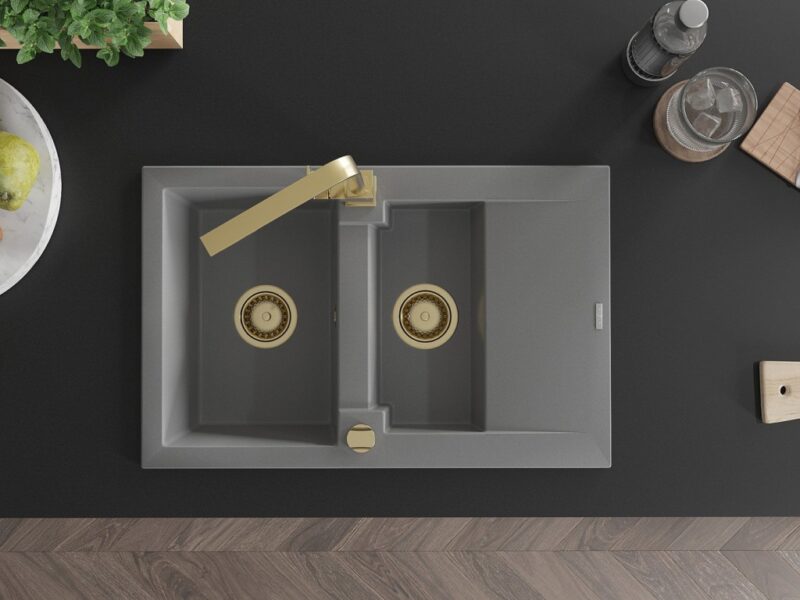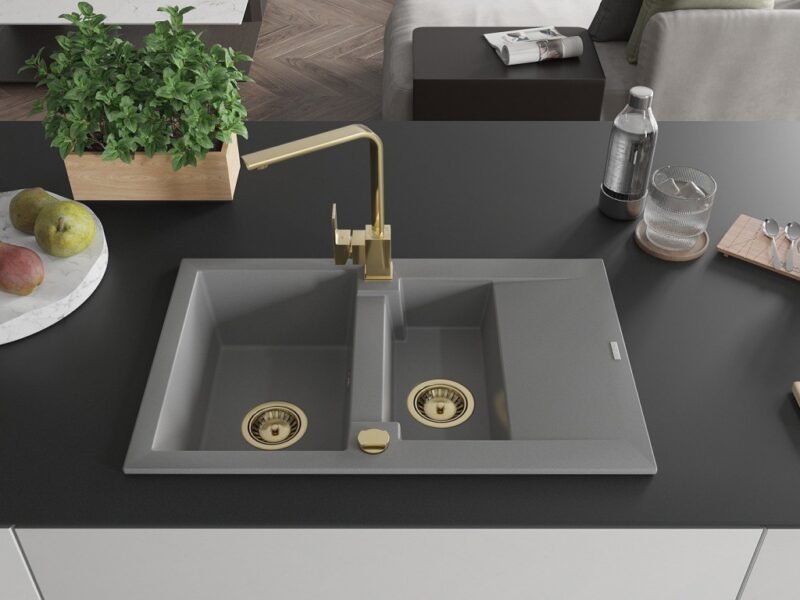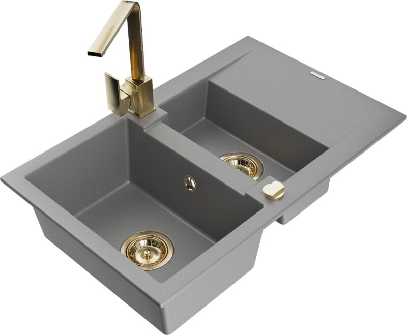 Technické dáta: Drez: Rozmer: 737x475x177 mm Hĺbka komory: 167 mm (väčšia), 107 mm (menšia) Rozmery komory: 395×272 mm (väčšie), (menšie) 375×182 mm Priemer odtoku: ø90 mm Typ: 1,5-miska s krátkym odkvapkávačom Typ: Zapustené do pracovnej dosky Šedá farba Povrchová úprava sifónu: zlatá Materiál: žula (80% žulové kamenivo 20% živice) Prepadový otvor: Áno Otvory: (batérie, automat) 2 Inštalácia: Univerzálna, je možné inštalovať s odkvapkávačom na ľavú alebo pravú stranu Vysoká odolnosť proti poškriabaniu a zmene farby Odolnosť proti tepelným šokom Povrch pre ľahké čistenie Kuchynská batéria: Materiál: mosadz Farba: Zlatá Hlava: Keramická Perlátor: Áno Typ: Jednopákové Výška batérie: 290 mm Rozsah výtoku: 220 mm(GT) Ean: 5905315018908