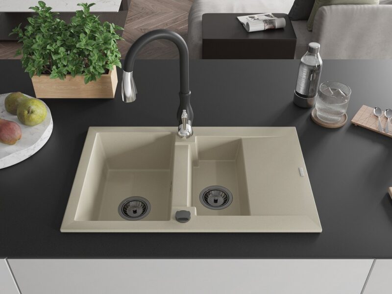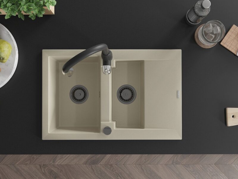 Technické dáta: Drez: Rozmer: 737x475x177 mm Hĺbka komory: 167 mm (väčšia), 107 mm (menšia) Rozmery komory: 395×272 mm (väčšie), (menšie) 375×182 mm Priemer odtoku: ø90 mm Typ: 1,5-miska s krátkym odkvapkávačom Typ: Zapustené do pracovnej dosky Farba béžová Povrchová úprava sifónu: čierna Materiál: žula (80% žulové kamenivo 20% živice) Prepadový otvor: Áno Otvory: (batérie, automat) 2 Inštalácia: Univerzálna, je možné inštalovať s odkvapkávačom na ľavú alebo pravú stranu Vysoká odolnosť proti poškriabaniu a zmene farby Odolnosť proti tepelným šokom Povrch pre ľahké čistenie Kuchynská batéria: Materiál: mosadz Čierna farba Hlava: Keramická Perlátor: Áno Typ: Jednopákové Výška batérie: 410 mm Rozsah výtoku: 231 mm(GT) Ean: 5905315034243