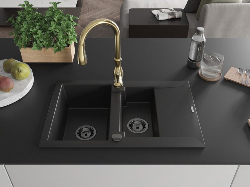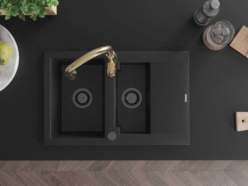Technické dáta: drez: Rozmer: 737x475x177mm Hĺbka komory: 167 mm (väčšia), 107 mm (menšia) Rozmery komory: 395×272 mm (väčšie), (menšie) 375×182 mm Priemer odtoku: ø90 mm Typ: 1,5-komorový s krátkym odkvapkávačom Typ: Zapustené do pracovnej dosky Čierna farba Povrchová úprava sifónu: čierna Materiál: žula (80% žulové kamenivo, 20% živice) Prepadový otvor: Áno Otvory: (batérie, automatické) 2 Inštalácia: Univerzálna, je možné inštalovať s odkvapkávačom na ľavú alebo pravú stranu Vysoká odolnosť proti poškriabaniu a zmene farby Odolnosť proti tepelným šokom Ľahko čistiteľný povrch kuchynská batéria: Materiál: mosadz Farba: Zlatá Hlava: Keramická Prevzdušňovač: Áno Typ: Jedna páka Výška batérie: 410 mm Rozsah výtoku: 231 mm(GT) Ean: 5905315034465