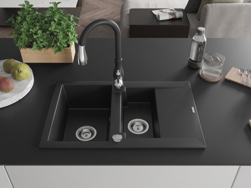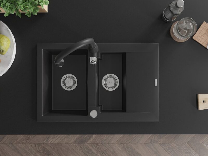 Technické dáta: drez: Rozmer: 737x475x177mm Hĺbka komory: 167 mm (väčšia), 107 mm (menšia) Rozmery komory: 395×272 mm (väčšie), (menšie) 375×182 mm Priemer odtoku: ø90 mm Typ: 1,5-komorový s krátkym odkvapkávačom Typ: Zapustené do pracovnej dosky Čierna farba Povrchová úprava sifónu: Chrome Materiál: žula (80% žulové kamenivo, 20% živice) Prepadový otvor: Áno Otvory: (batérie, automatické) 2 Inštalácia: Univerzálna, je možné inštalovať s odkvapkávačom na ľavú alebo pravú stranu Vysoká odolnosť proti poškriabaniu a zmene farby Odolnosť proti tepelným šokom Ľahko čistiteľný povrch kuchynská batéria: Materiál: mosadz Čierna farba Hlava: Keramická Prevzdušňovač: Áno Typ: Jedna páka Výška batérie: 410 mm Rozsah výtoku: 231 mm(GT) Ean: 5905315034489
