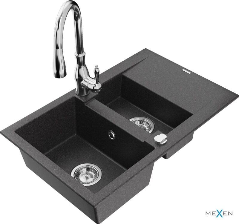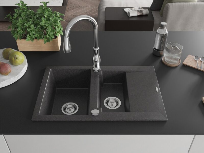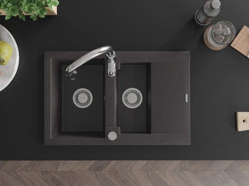 Technické dáta: drez: Rozmer: 737x475x177mm Hĺbka komory: 167 mm (väčšia), 107 mm (menšia) Rozmery komory: 395×272 mm (väčšie), (menšie) 375×182 mm Priemer odtoku: ø90 mm Typ: 1,5-miska s krátkym odkvapkávačom Typ: Zapustené do pracovnej dosky Farba: Škvrnitá čierna Povrchová úprava sifónu: Chrome Materiál: žula (80% žulové kamenivo, 20% živice) Prepadový otvor: Áno Otvory: (batérie, automatické) 2 Inštalácia: Univerzálna, je možné inštalovať s odkvapkávačom na ľavú alebo pravú stranu Vysoká odolnosť proti poškriabaniu a zmene farby Odolnosť proti tepelným šokom Ľahko čistiteľný povrch kuchynská batéria: Materiál: mosadz Farba: Chrome Hlava: Keramická Prevzdušňovač: Áno Typ: Jedna páka Výška batérie: 410 mm Rozsah výtoku: 231 mm(GT) Ean: 5905315034397