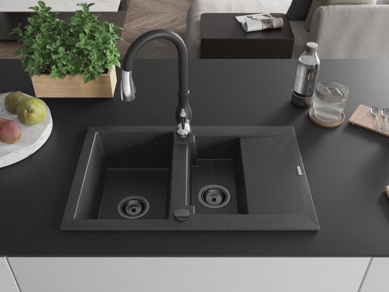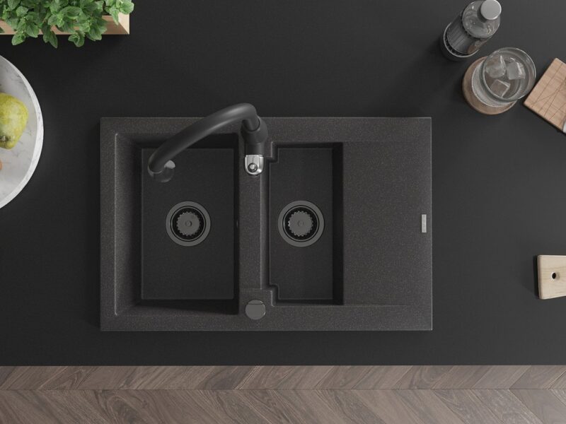 Technické dáta: drez: Rozmer: 737x475x177mm Hĺbka komory: 167 mm (väčšia), 107 mm (menšia) Rozmery komory: 395×272 mm (väčšie), (menšie) 375×182 mm Priemer odtoku: ø90 mm Typ: 1,5-miska s krátkym odkvapkávačom Typ: Zapustené do pracovnej dosky Farba: Škvrnitá čierna Povrchová úprava sifónu: čierna Materiál: žula (80% žulové kamenivo, 20% živice) Prepadový otvor: Áno Otvory: (batérie, automatické) 2 Inštalácia: Univerzálna, je možné inštalovať s odkvapkávačom na ľavú alebo pravú stranu Vysoká odolnosť proti poškriabaniu a zmene farby Odolnosť proti tepelným šokom Ľahko čistiteľný povrch kuchynská batéria: Materiál: mosadz Čierna farba Hlava: Keramická Prevzdušňovač: Áno Typ: Jedna páka Výška batérie: 410 mm Rozsah výtoku: 231 mm(GT) Ean: 5905315034427