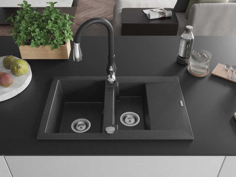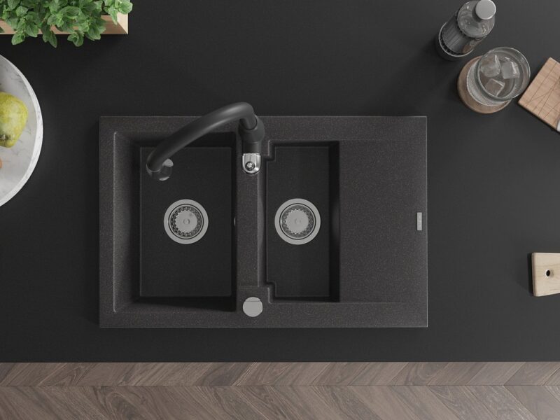 Technické dáta: drez: Rozmer: 737x475x177mm Hĺbka komory: 167 mm (väčšia), 107 mm (menšia) Rozmery komory: 395×272 mm (väčšie), (menšie) 375×182 mm Priemer odtoku: ø90 mm Typ: 1,5-miska s krátkym odkvapkávačom Typ: Zapustené do pracovnej dosky Farba: Škvrnitá čierna Povrchová úprava sifónu: Chrome Materiál: žula (80% žulové kamenivo, 20% živice) Prepadový otvor: Áno Otvory: (batérie, automatické) 2 Inštalácia: Univerzálna, je možné inštalovať s odkvapkávačom na ľavú alebo pravú stranu Vysoká odolnosť proti poškriabaniu a zmene farby Odolnosť proti tepelným šokom Ľahko čistiteľný povrch kuchynská batéria: Materiál: mosadz Čierna farba Hlava: Keramická Prevzdušňovač: Áno Typ: Jedna páka Výška batérie: 410 mm Rozsah výtoku: 231 mm(GT) Ean: 5905315034410