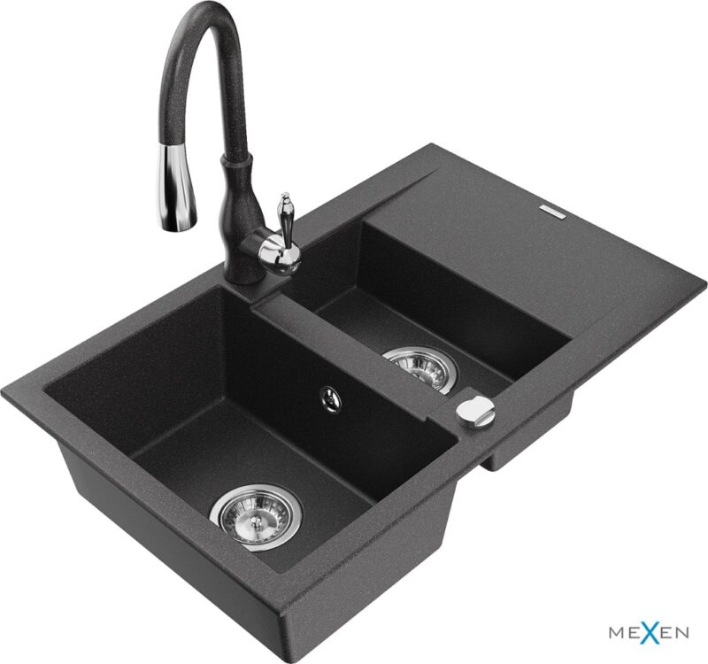 MEXEN/S MEXEN/S – Gaspar granitový drez 1.5 s odkvapkávačom vrátane batérie Savita, čierna kropenatá 6507-76-672601-76