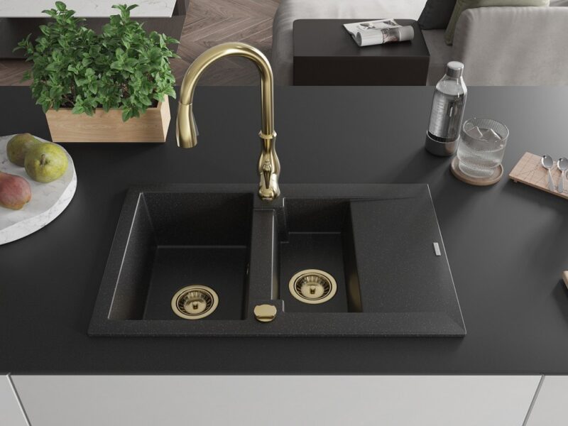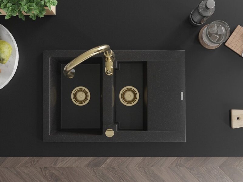 Technické dáta: drez: Rozmer: 737x475x177mm Hĺbka komory: 167 mm (väčšia), 107 mm (menšia) Rozmery komory: 395×272 mm (väčšie), (menšie) 375×182 mm Priemer odtoku: ø90 mm Typ: 1,5-komorový s krátkym odkvapkávačom Typ: Zapustené do pracovnej dosky Farba: čierna/strieborná metalíza Povrchová úprava sifónu: zlatá Materiál: žula (80% žulové kamenivo, 20% živice) Prepadový otvor: Áno Otvory: (batérie, automatické) 2 Inštalácia: Univerzálna, je možné inštalovať s odkvapkávačom na ľavú alebo pravú stranu Vysoká odolnosť proti poškriabaniu a zmene farby Odolnosť proti tepelným šokom Ľahko čistiteľný povrch kuchynská batéria: Materiál: mosadz Farba: Zlatá Hlava: Keramická Prevzdušňovač: Áno Typ: Jedna páka Výška batérie: 410 mm Rozsah výtoku: 231 mm(GT) Ean: 5905315034311