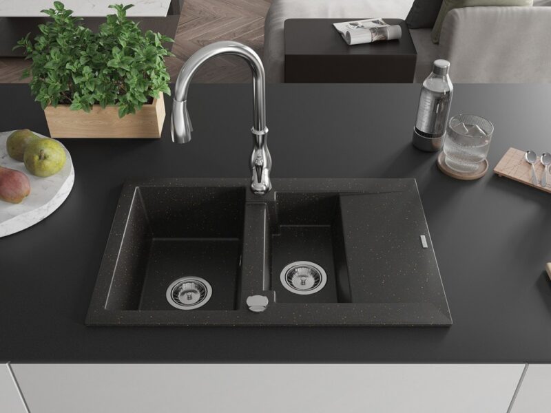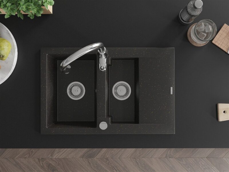 Technické dáta: drez: Rozmer: 737x475x177mm Hĺbka komory: 167 mm (väčšia), 107 mm (menšia) Rozmery komory: 395×272 mm (väčšie), (menšie) 375×182 mm Priemer odtoku: ø90 mm Typ: 1,5-komorový s krátkym odkvapkávačom Typ: Zapustené do pracovnej dosky Farba: čierna / zlatá metalíza Povrchová úprava sifónu: Chrome Materiál: žula (80% žulové kamenivo, 20% živice) Prepadový otvor: Áno Otvory: (batérie, automatické) 2 Inštalácia: Univerzálna, je možné inštalovať s odkvapkávačom na ľavú alebo pravú stranu Vysoká odolnosť proti poškriabaniu a zmene farby Odolnosť proti tepelným šokom Ľahko čistiteľný povrch kuchynská batéria: Materiál: mosadz Farba: Chrome Hlava: Keramická Prevzdušňovač: Áno Typ: Jedna páka Výška batérie: 410 mm Rozsah výtoku: 231 mm(GT) Ean: 5905315034342