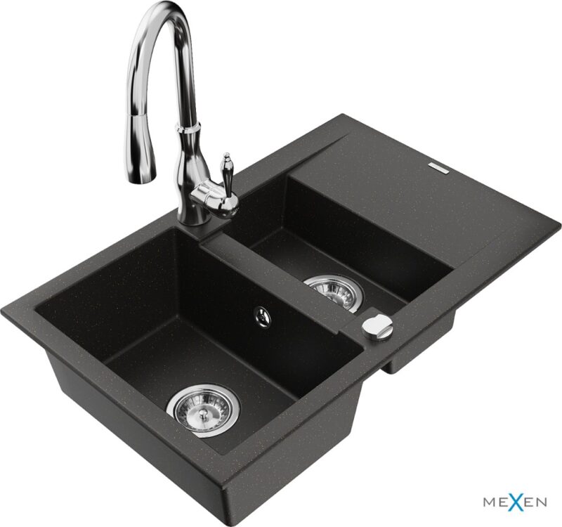 MEXEN/S MEXEN/S – Gaspar granitový drez 1.5 s odkvapkávačom vrátane batérie Savita, čierna/zlatá 6507-75-672601-00