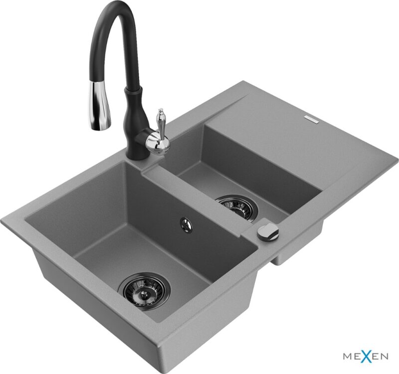MEXEN/S MEXEN/S – Gaspar granitový drez 1.5 s odkvapkávačom vrátane batérie Savita, šedá 6507-71-672601-70-B