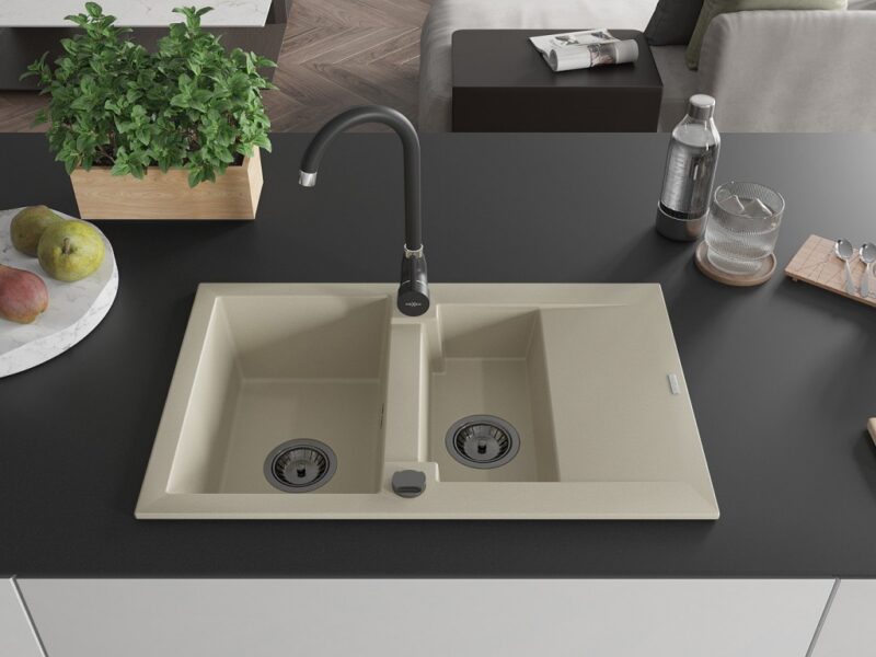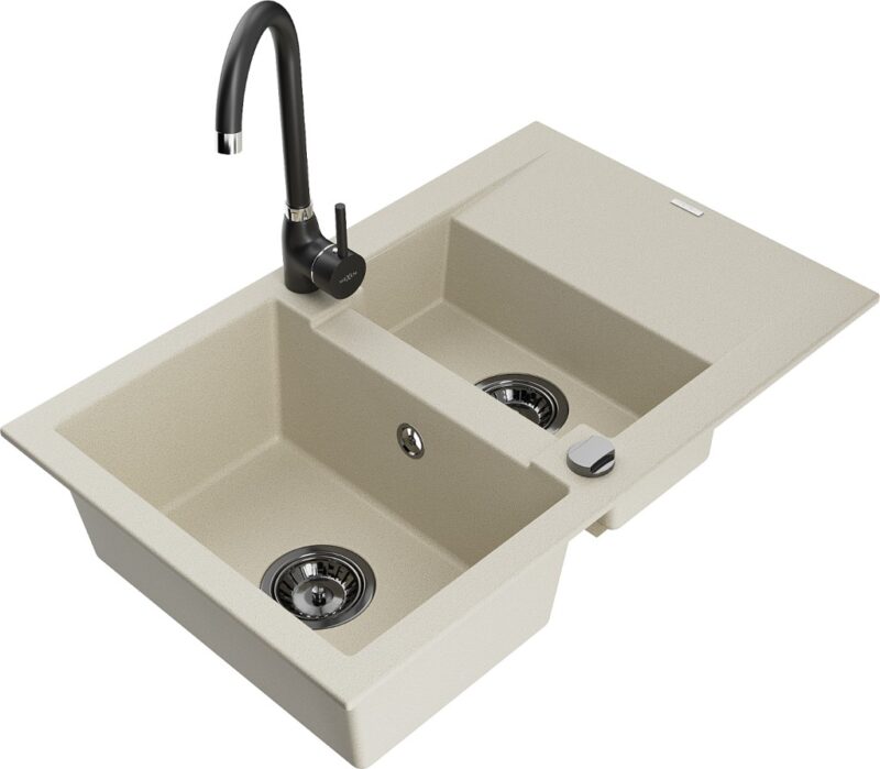 Technické dáta: Drez: Rozmer: 737x475x177 mm Hĺbka komory: 167 mm (väčšia), 107 mm (menšia) Rozmery komory: 395×272 mm (väčšie), (menšie) 375×182 mm Priemer odtoku: ø90 mm Typ: 1,5-miska s krátkym odkvapkávačom Typ: Zapustené do pracovnej dosky Farba béžová Povrchová úprava sifónu: čierna Materiál: žula (80% žulové kamenivo 20% živice) Prepadový otvor: Áno Otvory: (batérie, automat) 2 Inštalácia: Univerzálna, je možné inštalovať s odkvapkávačom na ľavú alebo pravú stranu Vysoká odolnosť proti poškriabaniu a zmene farby Odolnosť proti tepelným šokom Povrch pre ľahké čistenie Kuchynská batéria: Materiál: mosadz Čierna farba Hlava: Keramická Perlátor: Áno Typ: Jednopákové Výška batérie: 335 mm Rozsah výtoku: 180 mm(GT) Ean: 5905315014771
