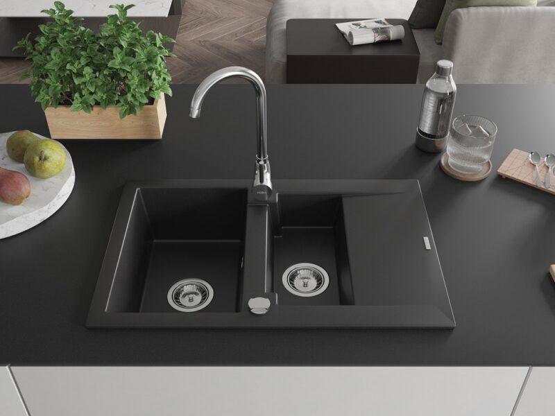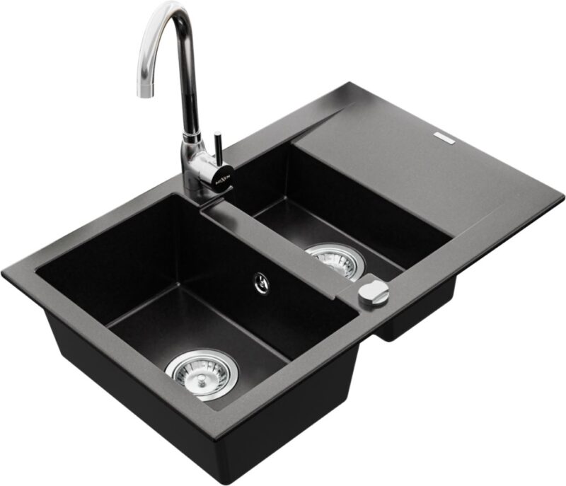 Technické dáta: drez: Rozmer: 737x475x177mm Hĺbka komory: 167 mm (väčšia), 107 mm (menšia) Rozmery komory: 395×272 mm (väčšie), (menšie) 375×182 mm Priemer odtoku: ø90 mm Typ: 1,5-komorový s krátkym odkvapkávačom Typ: Zapustené do pracovnej dosky Čierna farba Povrchová úprava sifónu: Chrome Materiál: žula (80% žulové kamenivo, 20% živice) Prepadový otvor: Áno Otvory: (batérie, automatické) 2 Inštalácia: Univerzálna, je možné inštalovať s odkvapkávačom na ľavú alebo pravú stranu Vysoká odolnosť proti poškriabaniu a zmene farby Odolnosť proti tepelným šokom Ľahko čistiteľný povrch kuchynská batéria: Materiál: mosadz Farba: Chrome Hlava: Keramická Prevzdušňovač: Áno Výška batérie: 335 mm Rozsah výtoku: 180 mm(GT) Ean: 5907709189966
