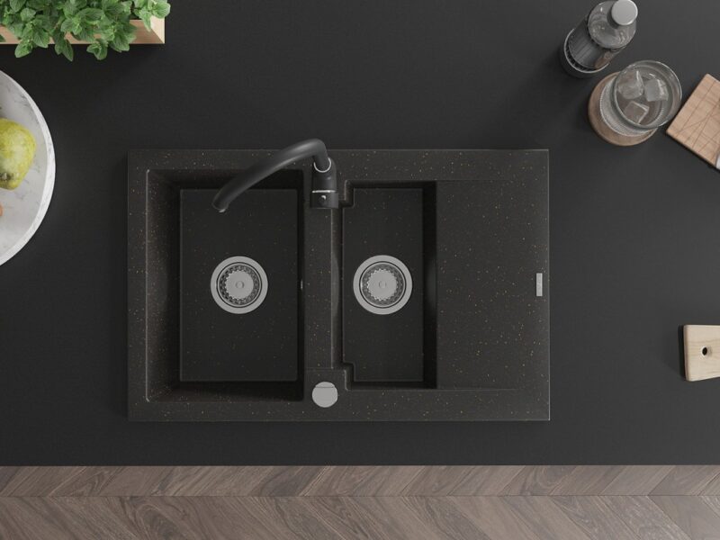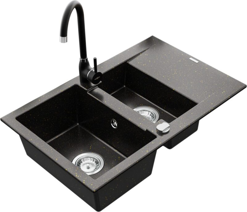 Technické dáta: drez: Rozmer: 737x475x177mm Hĺbka komory: 167 mm (väčšia), 107 mm (menšia) Rozmery komory: 395×272 mm (väčšie), (menšie) 375×182 mm Priemer odtoku: ø90 mm Typ: 1,5-komorový s krátkym odkvapkávačom Typ: Zapustené do pracovnej dosky Farba: čierna / zlatá metalíza Povrchová úprava sifónu: Chrome Materiál: žula (80% žulové kamenivo, 20% živice) Prepadový otvor: Áno Otvory: (batérie, automatické) 2 Inštalácia: Univerzálna, je možné inštalovať s odkvapkávačom na ľavú alebo pravú stranu Vysoká odolnosť proti poškriabaniu a zmene farby Odolnosť proti tepelným šokom Ľahko čistiteľný povrch kuchynská batéria: Materiál: mosadz Čierna farba Hlava: Keramická Prevzdušňovač: Áno Výška batérie: 335 mm Rozsah výtoku: 180 mm(GT) Ean: 5907709189935