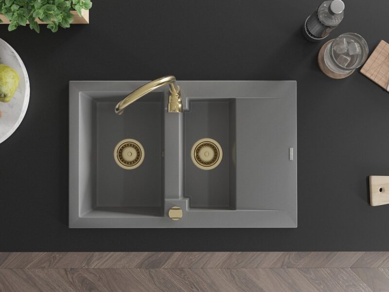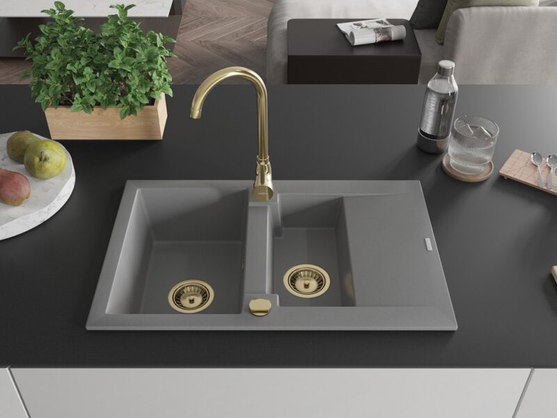 Technické dáta: Drez: Rozmer: 737x475x177 mm Hĺbka komory: 167 mm (väčšia), 107 mm (menšia) Rozmery komory: 395×272 mm (väčšie), (menšie) 375×182 mm Priemer odtoku: ø90 mm Typ: 1,5-miska s krátkym odkvapkávačom Typ: Zapustené do pracovnej dosky Šedá farba Povrchová úprava sifónu: zlatá Materiál: žula (80% žulové kamenivo 20% živice) Prepadový otvor: Áno Otvory: (batérie, automat) 2 Inštalácia: Univerzálna, je možné inštalovať s odkvapkávačom na ľavú alebo pravú stranu Vysoká odolnosť proti poškriabaniu a zmene farby Odolnosť proti tepelným šokom Povrch pre ľahké čistenie Kuchynská batéria: Materiál: mosadz Farba: Zlatá Hlava: Keramická Perlátor: Áno Typ: Jednopákové Výška batérie: 335 mm Rozsah výtoku: 180 mm(GT) Ean: 5905315014788