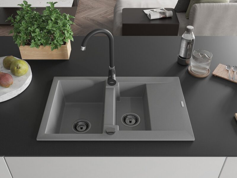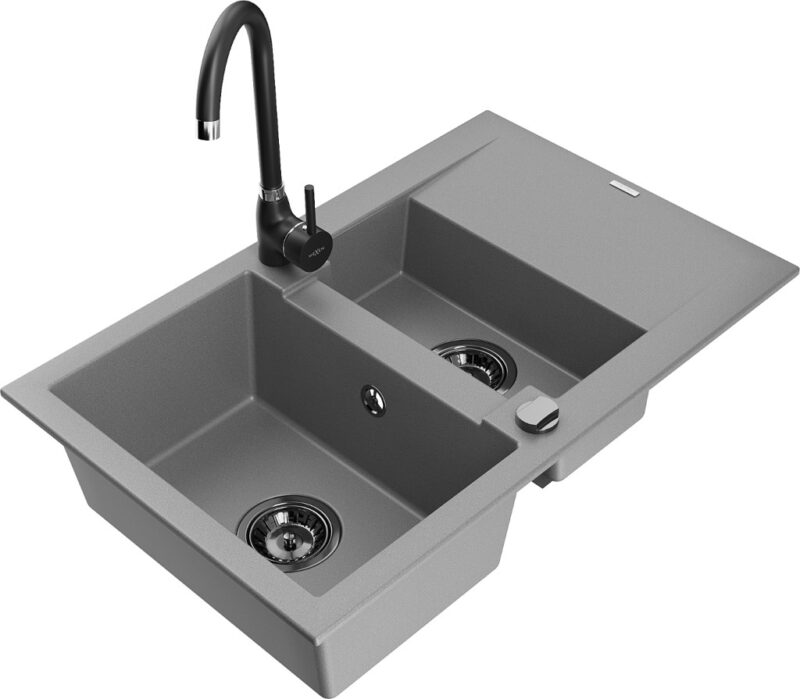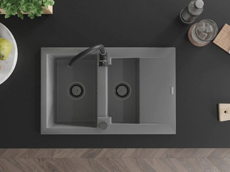 Technické dáta: Drez: Rozmer: 737x475x177 mm Hĺbka komory: 167 mm (väčšia), 107 mm (menšia) Rozmery komory: 395×272 mm (väčšie), (menšie) 375×182 mm Priemer odtoku: ø90 mm Typ: 1,5-miska s krátkym odkvapkávačom Typ: Zapustené do pracovnej dosky Šedá farba Povrchová úprava sifónu: čierna Materiál: žula (80% žulové kamenivo 20% živice) Prepadový otvor: Áno Otvory: (batérie, automat) 2 Inštalácia: Univerzálna, je možné inštalovať s odkvapkávačom na ľavú alebo pravú stranu Vysoká odolnosť proti poškriabaniu a zmene farby Odolnosť proti tepelným šokom Povrch pre ľahké čistenie Kuchynská batéria: Materiál: mosadz Čierna farba Hlava: Keramická Perlátor: Áno Typ: Jednopákové Výška batérie: 335 mm Rozsah výtoku: 180 mm(GT) Ean: 5905315014801