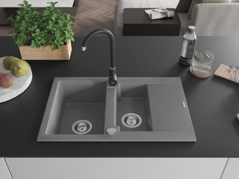 Technické dáta: Drez: Rozmer: 737x475x177 mm Hĺbka komory: 167 mm (väčšia), 107 mm (menšia) Rozmery komory: 395×272 mm (väčšie), (menšie) 375×182 mm Priemer odtoku: ø90 mm Typ: 1,5-miska s krátkym odkvapkávačom Typ: Zapustené do pracovnej dosky Šedá farba Povrchová úprava sifónu: Chrome Materiál: žula (80% žulové kamenivo 20% živice) Prepadový otvor: Áno Otvory: (batérie, automat) 2 Inštalácia: Univerzálna, je možné inštalovať s odkvapkávačom na ľavú alebo pravú stranu Vysoká odolnosť proti poškriabaniu a zmene farby Odolnosť proti tepelným šokom Povrch pre ľahké čistenie Kuchynská batéria: Materiál: mosadz Čierna farba Hlava: Keramická Perlátor: Áno Typ: Jednopákové Výška batérie: 335 mm Rozsah výtoku: 180 mm(GT) Ean: 5905315014795