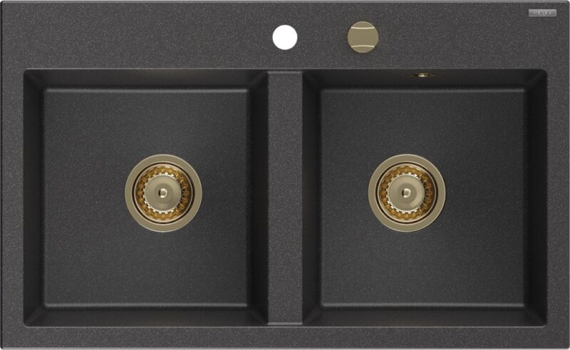 MEXEN/S MEXEN/S – Hektor granitový drez 2-bowl 800 x 480 mm, čierna kropenatá, zlatý sifón 6521802000-76-G