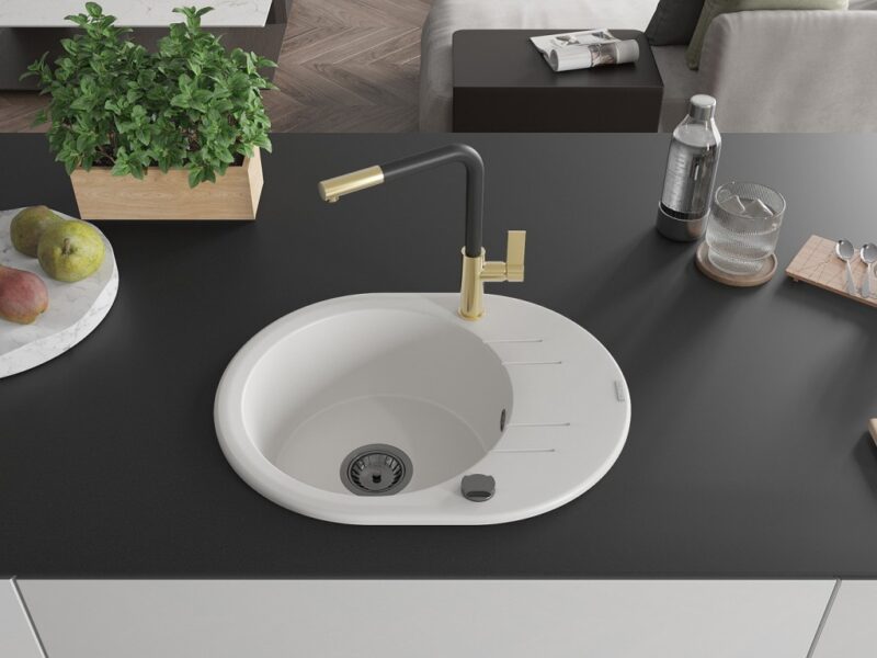 Technické dáta: drez: Rozmer: 586 x 458 x 190 mm Hĺbka komory: 180 mm Šírka komory: 378×374 mm Priemer odtoku: ø90 mm Typ: 1-miska s krátkym odkvapkávačom Typ: Zapustené do pracovnej dosky biela farba Povrchová úprava sifónu: čierna Materiál: žula (80% žulové kamenivo, 20% živice) Prepadový otvor: Áno Otvory: (batérie, automatické) 2 Inštalácia: Univerzálna, je možné inštalovať s odkvapkávačom na ľavú alebo pravú stranu Vysoká odolnosť proti poškriabaniu a zmene farby Odolnosť proti tepelným šokom Ľahko čistiteľný povrch Dva dodatočné vyfrézované otvory na samodierovanie ø35 kuchynská batéria: Materiál: mosadz Farba: Zlatá/Čierna Hlava: Keramická Prevzdušňovač: Áno Typ: Jedna páka Rozsah výtoku: 245 mm Výška batérie: 307 mm(GT) Ean: 5905315063014