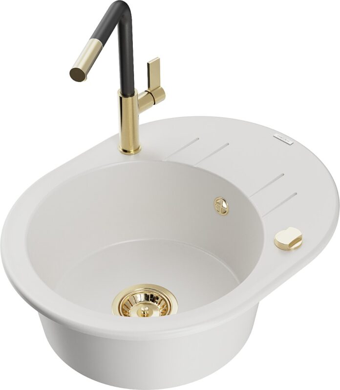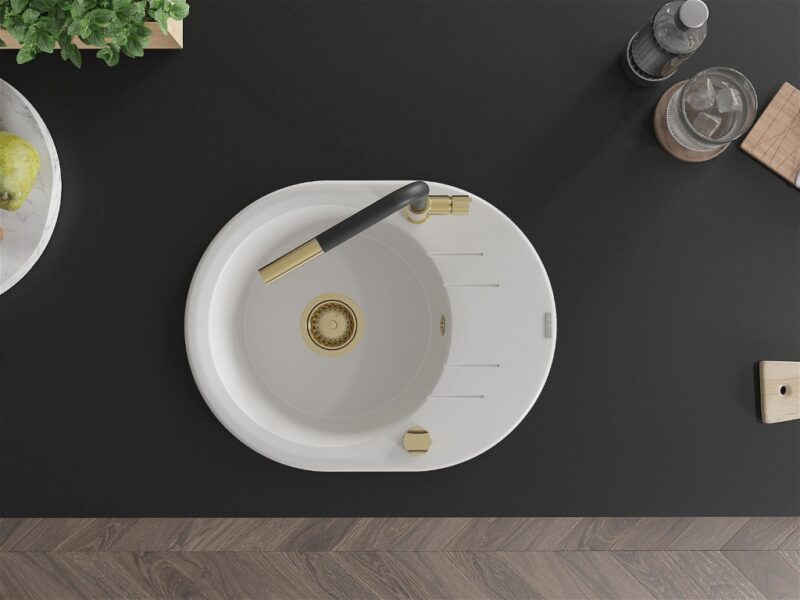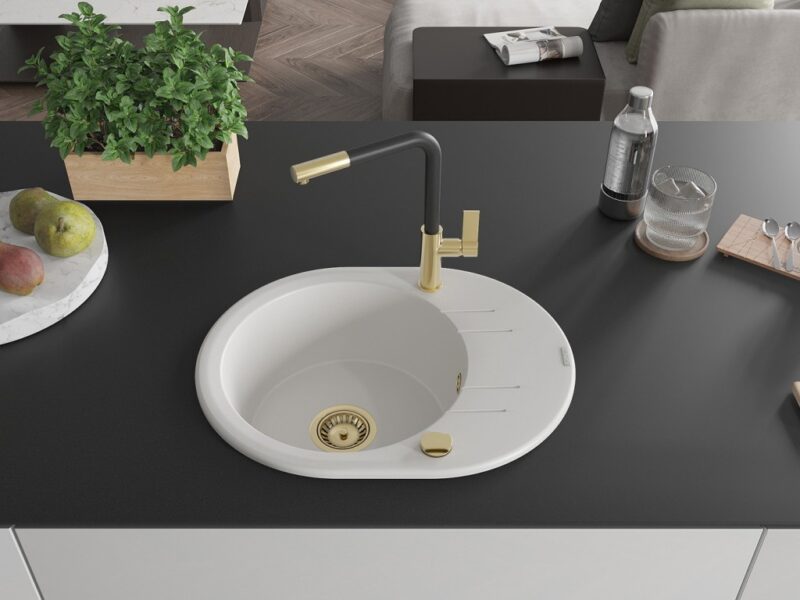 Technické dáta: drez: Rozmer: 586 x 458 x 190 mm Hĺbka komory: 180 mm Šírka komory: 378×374 mm Priemer odtoku: ø90 mm Typ: 1-miska s krátkym odkvapkávačom Typ: Zapustené do pracovnej dosky biela farba Povrchová úprava sifónu: zlatá Materiál: žula (80% žulové kamenivo, 20% živice) Prepadový otvor: Áno Otvory: (batérie, automatické) 2 Inštalácia: Univerzálna, je možné inštalovať s odkvapkávačom na ľavú alebo pravú stranu Vysoká odolnosť proti poškriabaniu a zmene farby Odolnosť proti tepelným šokom Ľahko čistiteľný povrch Dva dodatočné vyfrézované otvory na samodierovanie ø35 kuchynská batéria: Materiál: mosadz Farba: Zlatá/Čierna Hlava: Keramická Prevzdušňovač: Áno Typ: Jedna páka Rozsah výtoku: 245 mm Výška batérie: 307 mm(GT) Ean: 5905315063007