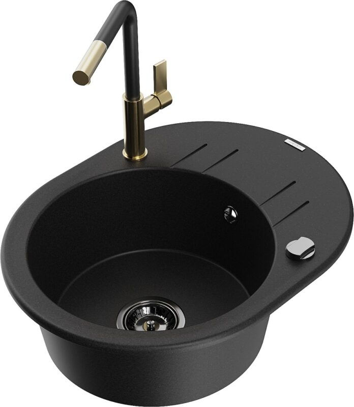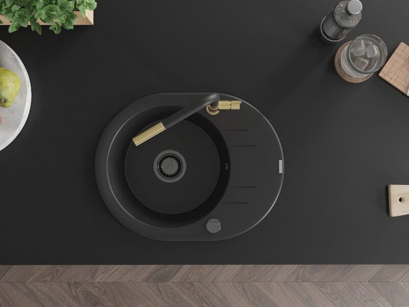 Technické dáta: drez: Rozmer: 586 x 458 x 190 mm Hĺbka komory: 180 mm Šírka komory: 378×374 mm Priemer odtoku: ø90 mm Typ: 1-miska s krátkym odkvapkávačom Typ: Zapustené do pracovnej dosky Čierna farba Povrchová úprava sifónu: čierna Materiál: žula (80% žulové kamenivo, 20% živice) Prepadový otvor: Áno Otvory: (batérie, automatické) 2 Inštalácia: Univerzálna, je možné inštalovať s odkvapkávačom na ľavú alebo pravú stranu Vysoká odolnosť proti poškriabaniu a zmene farby Odolnosť proti tepelným šokom Ľahko čistiteľný povrch Dva dodatočné vyfrézované otvory na samodierovanie ø35 kuchynská batéria: Materiál: mosadz Farba: Zlatá/Čierna Hlava: Keramická Prevzdušňovač: Áno Typ: Jedna páka Rozsah výtoku: 245 mm Výška batérie: 307 mm(GT) Ean: 5905315063434