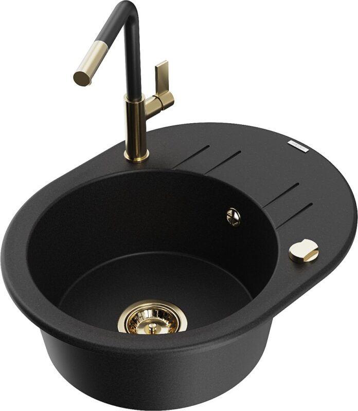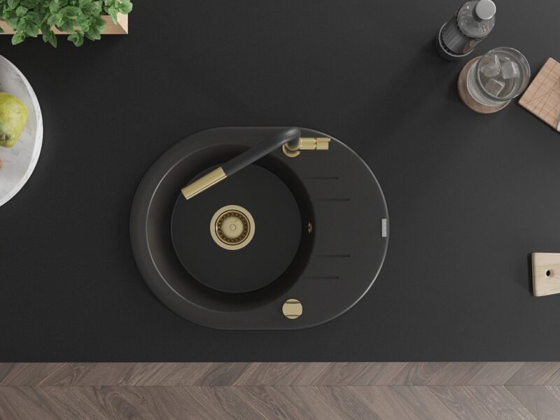 Technické dáta: drez: Rozmer: 586 x 458 x 190 mm Hĺbka komory: 180 mm Šírka komory: 378×374 mm Priemer odtoku: ø90 mm Typ: 1-miska s krátkym odkvapkávačom Typ: Zapustené do pracovnej dosky Čierna farba Povrchová úprava sifónu: zlatá Materiál: žula (80% žulové kamenivo, 20% živice) Prepadový otvor: Áno Otvory: (batérie, automatické) 2 Inštalácia: Univerzálna, je možné inštalovať s odkvapkávačom na ľavú alebo pravú stranu Vysoká odolnosť proti poškriabaniu a zmene farby Odolnosť proti tepelným šokom Ľahko čistiteľný povrch Dva dodatočné vyfrézované otvory na samodierovanie ø35 kuchynská batéria: Materiál: mosadz Farba: Zlatá/Čierna Hlava: Keramická Prevzdušňovač: Áno Typ: Jedna páka Rozsah výtoku: 245 mm Výška batérie: 307 mm(GT) Ean: 5905315063427
