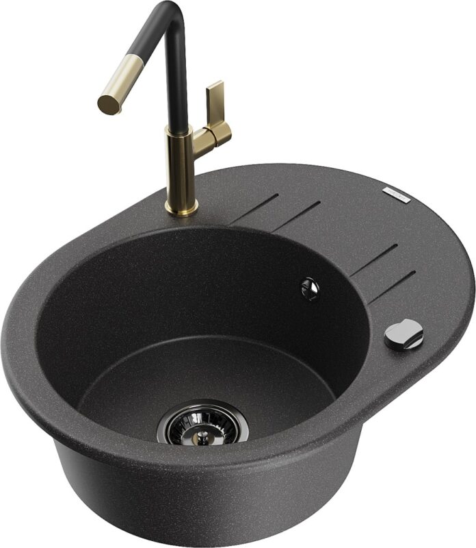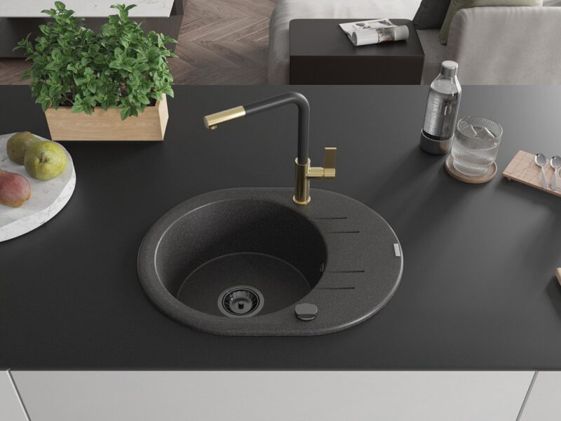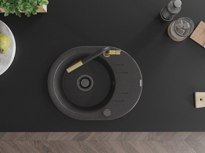 Technické dáta: drez: Rozmer: 586 x 458 x 190 mm Hĺbka komory: 180 mm Šírka komory: 378×374 mm Priemer odtoku: ø90 mm Typ: 1-miska s krátkym odkvapkávačom Typ: Zapustené do pracovnej dosky Farba: Škvrnitá čierna Povrchová úprava sifónu: čierna Materiál: žula (80% žulové kamenivo, 20% živice) Prepadový otvor: Áno Otvory: (batérie, automatické) 2 Inštalácia: Univerzálna, je možné inštalovať s odkvapkávačom na ľavú alebo pravú stranu Vysoká odolnosť proti poškriabaniu a zmene farby Odolnosť proti tepelným šokom Ľahko čistiteľný povrch Dva dodatočné vyfrézované otvory na samodierovanie ø35 kuchynská batéria: Materiál: mosadz Farba: Zlatá/Čierna Hlava: Keramická Prevzdušňovač: Áno Typ: Jedna páka Rozsah výtoku: 245 mm Výška batérie: 307 mm(GT) Ean: 5905315063359