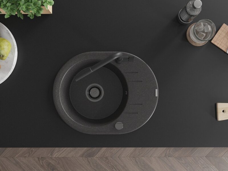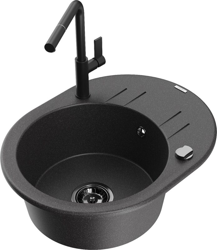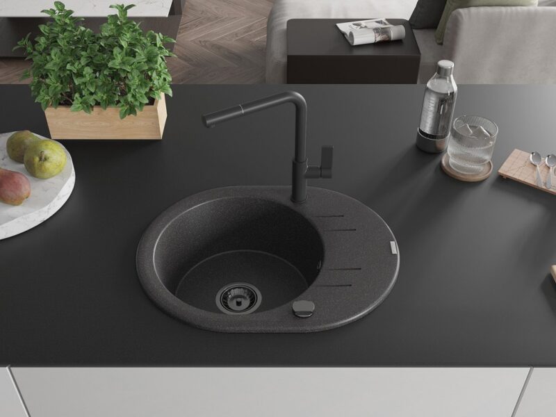 Technické dáta: drez: Rozmer: 586 x 458 x 190 mm Hĺbka komory: 180 mm Šírka komory: 378×374 mm Priemer odtoku: ø90 mm Typ: 1-miska s krátkym odkvapkávačom Typ: Zapustené do pracovnej dosky Farba: Škvrnitá čierna Povrchová úprava sifónu: čierna Materiál: žula (80% žulové kamenivo, 20% živice) Prepadový otvor: Áno Otvory: (batérie, automatické) 2 Inštalácia: Univerzálna, je možné inštalovať s odkvapkávačom na ľavú alebo pravú stranu Vysoká odolnosť proti poškriabaniu a zmene farby Odolnosť proti tepelným šokom Ľahko čistiteľný povrch Dva dodatočné vyfrézované otvory na samodierovanie ø35 kuchynská batéria: Materiál: mosadz Čierna farba Hlava: Keramická Prevzdušňovač: Áno Typ: Jedna páka Rozsah výtoku: 245 mm Výška batérie: 307 mm(GT) Ean: 5905315063366