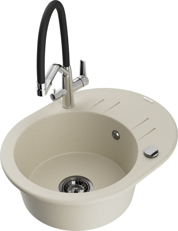 Technické dáta: Drez: Rozmer: 586x458x190 mm Hĺbka komory: 180 mm Šírka komory: 378×374 mm Priemer odtoku: ø90 mm Typ: 1-miska s krátkym odkvapkávačom Typ: Zapustené do pracovnej dosky Farba béžová Povrchová úprava sifónu: čierna Materiál: žula (80% žulové kamenivo 20% živice) Prepadový otvor: Áno Otvory: (batérie, automat) 2 Inštalácia: Univerzálna, je možné inštalovať s odkvapkávačom na ľavú alebo pravú stranu Vysoká odolnosť proti poškriabaniu a zmene farby Odolnosť proti tepelným šokom Povrch pre ľahké čistenie Dva dodatočné vyfrézované otvory na samodierovanie ø35 Kuchynská batéria: Materiál: mosadz Farba: chróm/čierna Hlavy: Keramické Perlátor: Áno Typ výtoku: Flexibilný s mosadzným držiakom Rozsah výtoku: 260 mm Výška: 405 mm Typ: Dve rukoväte Dvojhlavá batéria s prídavným filtrom na pitnú vodu(GT) Ean: 5905315055194