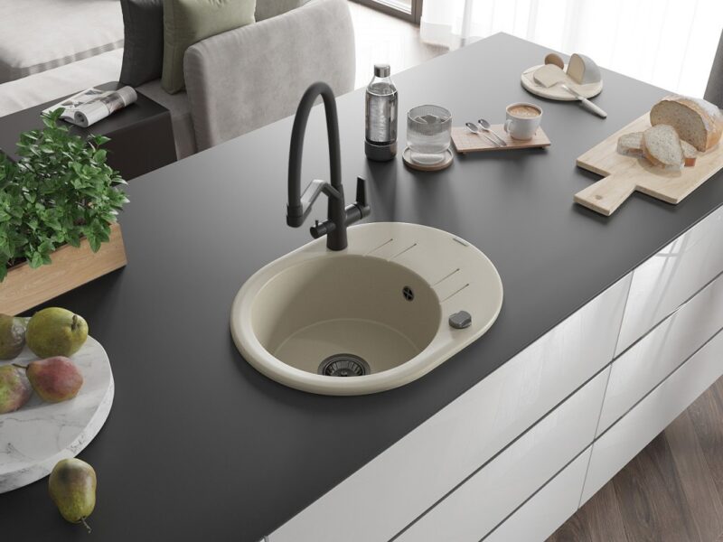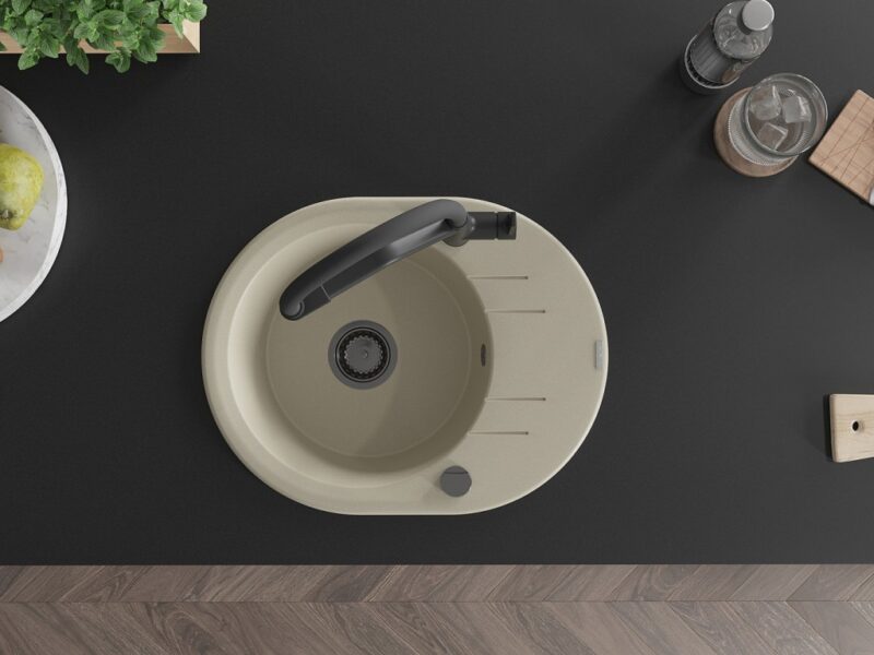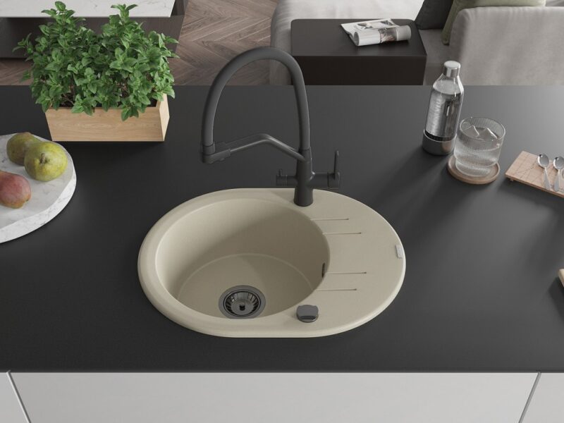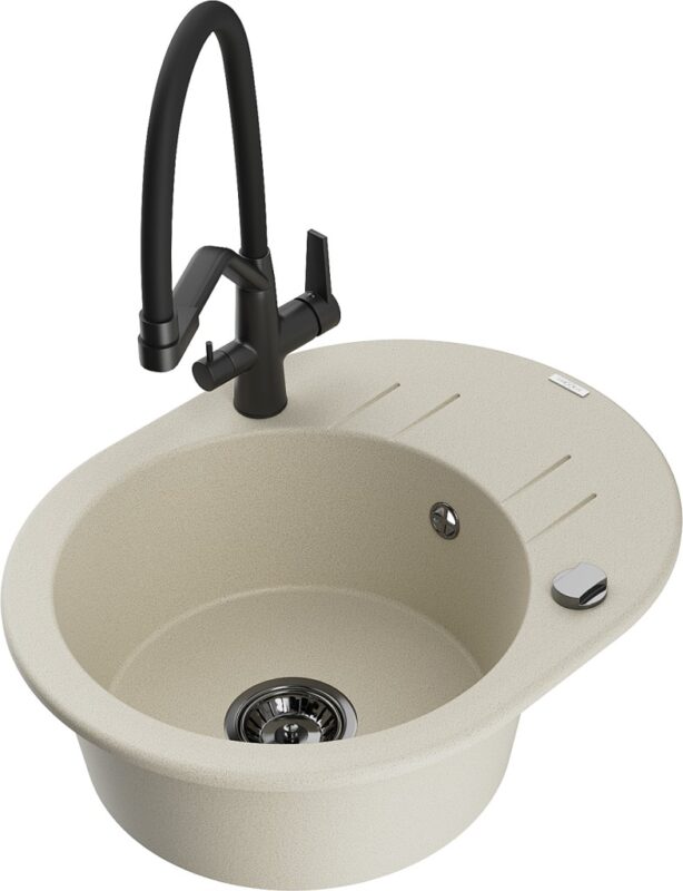 Technické dáta: Drez: Rozmer: 586x458x190 mm Hĺbka komory: 180 mm Šírka komory: 378×374 mm Priemer odtoku: ø90 mm Typ: 1-miska s krátkym odkvapkávačom Typ: Zapustené do pracovnej dosky Farba béžová Povrchová úprava sifónu: čierna Materiál: žula (80% žulové kamenivo 20% živice) Prepadový otvor: Áno Otvory: (batérie, automat) 2 Inštalácia: Univerzálna, je možné inštalovať s odkvapkávačom na ľavú alebo pravú stranu Vysoká odolnosť proti poškriabaniu a zmene farby Odolnosť proti tepelným šokom Povrch pre ľahké čistenie Dva dodatočné vyfrézované otvory na samodierovanie ø35 Kuchynská batéria: Materiál: mosadz Čierna farba Hlavy: Keramické Perlátor: Áno Typ výtoku: Flexibilný s mosadznou podperou Rozsah výtoku: 260 mm Výška: 405 mm Typ: Dve rukoväte Dvojhlavá batéria s prídavným filtrom na pitnú vodu(GT) Ean: 5905315055224
