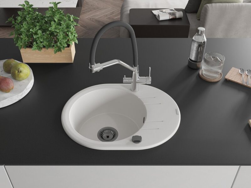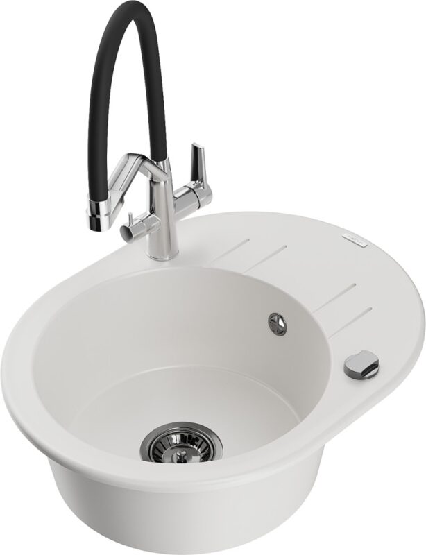 Technické dáta: Drez: Rozmer: 586x458x190 mm Hĺbka komory: 180 mm Šírka komory: 378×374 mm Priemer odtoku: ø90 mm Typ: 1-miska s krátkym odkvapkávačom Typ: Zapustené do pracovnej dosky biela farba Povrchová úprava sifónu: čierna Materiál: žula (80% žulové kamenivo 20% živice) Prepadový otvor: Áno Otvory: (batérie, automat) 2 Inštalácia: Univerzálna, je možné inštalovať s odkvapkávačom na ľavú alebo pravú stranu Vysoká odolnosť proti poškriabaniu a zmene farby Odolnosť proti tepelným šokom Povrch pre ľahké čistenie Dva dodatočné vyfrézované otvory na samodierovanie ø35 Kuchynská batéria: Materiál: mosadz Farba: chróm/čierna Hlavy: Keramické Perlátor: Áno Typ výtoku: Flexibilný s mosadzným držiakom Rozsah výtoku: 260 mm Výška: 405 mm Typ: Dve rukoväte Dvojhlavá batéria s prídavným filtrom na pitnú vodu(GT) Ean: 5905315055132