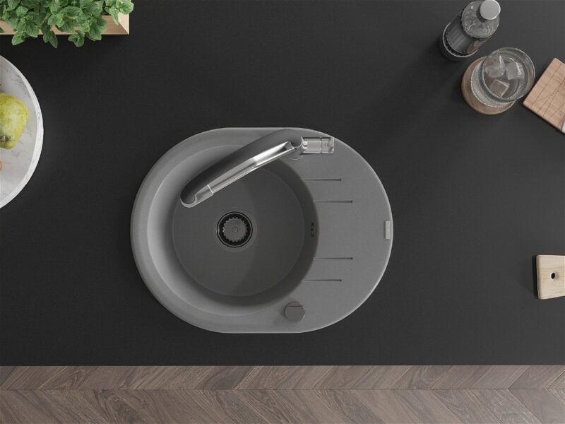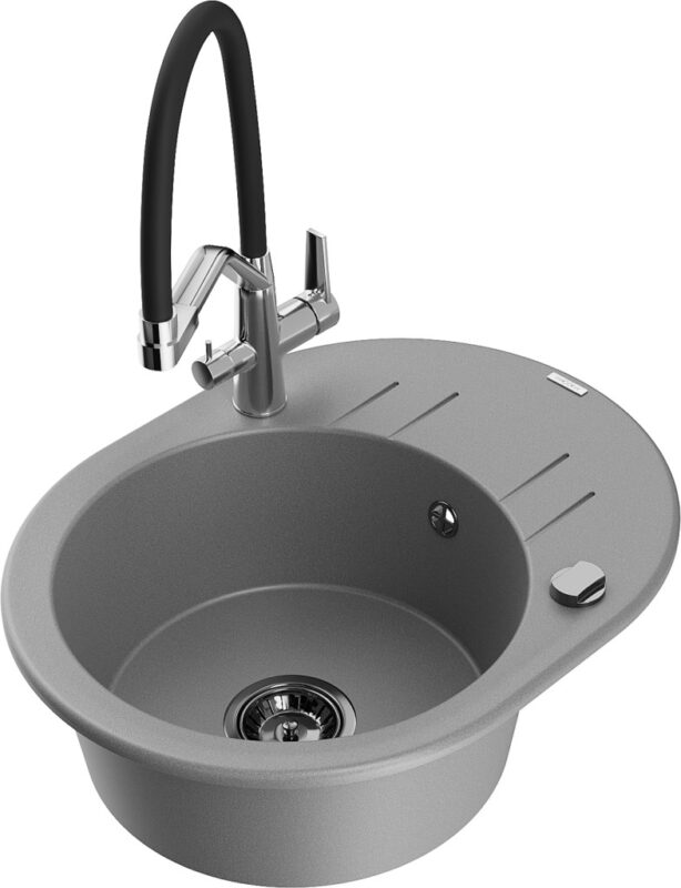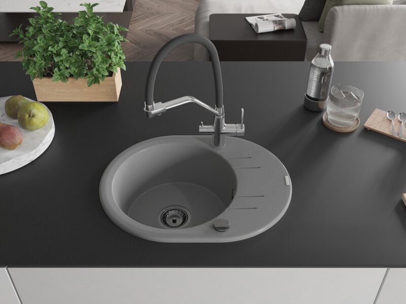 Technické dáta: drez: Rozmer: 586 x 458 x 190 mm Hĺbka komory: 180 mm Šírka komory: 378×374 mm Priemer odtoku: ø90 mm Typ: 1-miska s krátkym odkvapkávačom Typ: Zapustené do pracovnej dosky Šedá farba Povrchová úprava sifónu: čierna Materiál: žula (80% žulové kamenivo, 20% živice) Prepadový otvor: Áno Otvory: (batérie, automatické) 2 Inštalácia: Univerzálna, je možné inštalovať s odkvapkávačom na ľavú alebo pravú stranu Vysoká odolnosť proti poškriabaniu a zmene farby Odolnosť proti tepelným šokom Ľahko čistiteľný povrch Dva dodatočné vyfrézované otvory na samodierovanie ø35 kuchynská batéria: Materiál: mosadz Farba: chróm/čierna Hlavy: Keramické Prevzdušňovač: Áno Typ hubica: Flexibilný s mosadzným držiakom Rozsah výtoku: 260 mm Výška: 405 mm Typ: Dve rukoväte Dvojhlavá batéria s prídavným filtrom na pitnú vodu(GT) Ean: 5905315055255
