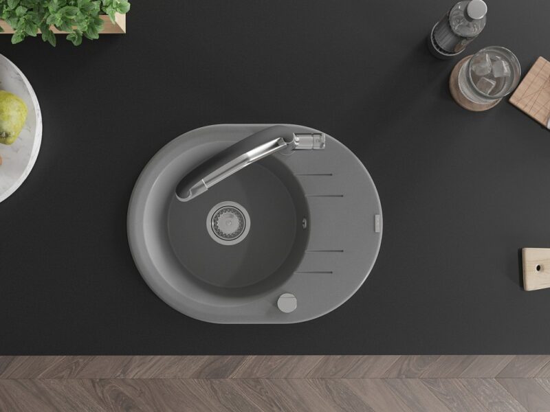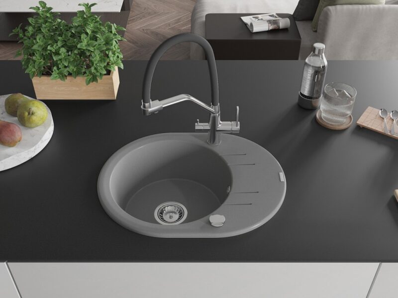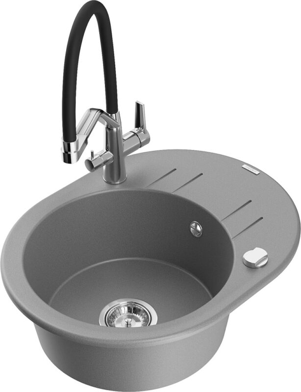 Technické dáta: drez: Rozmer: 586 x 458 x 190 mm Hĺbka komory: 180 mm Šírka komory: 378×374 mm Priemer odtoku: ø90 mm Typ: 1-miska s krátkym odkvapkávačom Typ: Zapustené do pracovnej dosky Šedá farba Povrchová úprava sifónu: Chrome Materiál: žula (80% žulové kamenivo, 20% živice) Prepadový otvor: Áno Otvory: (batérie, automatické) 2 Inštalácia: Univerzálna, je možné inštalovať s odkvapkávačom na ľavú alebo pravú stranu Vysoká odolnosť proti poškriabaniu a zmene farby Odolnosť proti tepelným šokom Ľahko čistiteľný povrch Dva dodatočné vyfrézované otvory na samodierovanie ø35 kuchynská batéria: Materiál: mosadz Farba: chróm/čierna Hlavy: Keramické Prevzdušňovač: Áno Typ hubica: Flexibilný s mosadzným držiakom Rozsah výtoku: 260 mm Výška: 405 mm Typ: Dve rukoväte Dvojhlavá batéria s prídavným filtrom na pitnú vodu(GT) Ean: 5905315055248