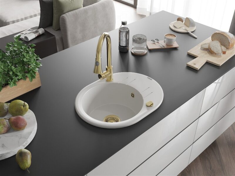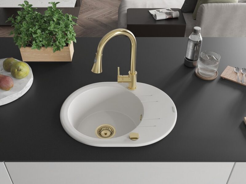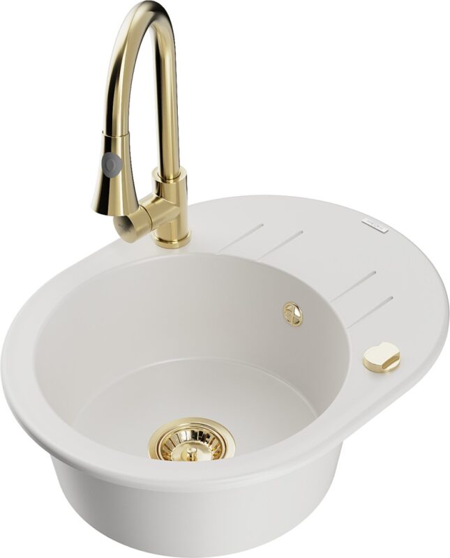 Technické dáta: drez: Rozmer: 586 x 458 x 190 mm Hĺbka komory: 180 mm Šírka komory: 378×374 mm Priemer odtoku: ø90 mm Typ: 1-miska s krátkym odkvapkávačom Typ: Zapustené do pracovnej dosky biela farba Povrchová úprava sifónu: zlatá Materiál: žula (80% žulové kamenivo, 20% živice) Prepadový otvor: Áno Otvory: (batérie, automatické) 2 Inštalácia: Univerzálna, je možné inštalovať s odkvapkávačom na ľavú alebo pravú stranu Vysoká odolnosť proti poškriabaniu a zmene farby Odolnosť proti tepelným šokom Ľahko čistiteľný povrch Dva dodatočné vyfrézované otvory na samodierovanie ø35 kuchynská batéria: Materiál: mosadz Farba: Zlatá Hlava: Keramická Prevzdušňovač: Áno Typ: Jedna páka Výška batérie: 380 mm Rozsah výtoku: 252 mm Typ výtoku: Výsuvný(GT) Ean: 5905315031631