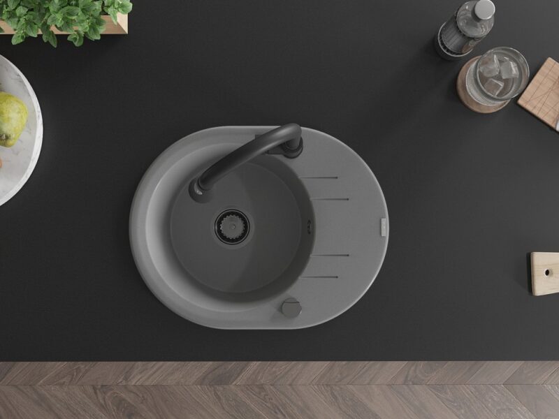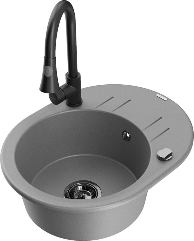 Technické dáta: drez: Rozmer: 586 x 458 x 190 mm Hĺbka komory: 180 mm Šírka komory: 378×374 mm Priemer odtoku: ø90 mm Typ: 1-miska s krátkym odkvapkávačom Typ: Zapustené do pracovnej dosky Šedá farba Povrchová úprava sifónu: čierna Materiál: žula (80% žulové kamenivo, 20% živice) Prepadový otvor: Áno Otvory: (batérie, automatické) 2 Inštalácia: Univerzálna, je možné inštalovať s odkvapkávačom na ľavú alebo pravú stranu Vysoká odolnosť proti poškriabaniu a zmene farby Odolnosť proti tepelným šokom Ľahko čistiteľný povrch Dva dodatočné vyfrézované otvory na samodierovanie ø35 kuchynská batéria: Materiál: mosadz Čierna farba Hlava: Keramická Prevzdušňovač: Áno Typ: Jedna páka Výška batérie: 380 mm Rozsah výtoku: 252 mm Typ výtoku: Výsuvný(GT) Ean: 5905315031723