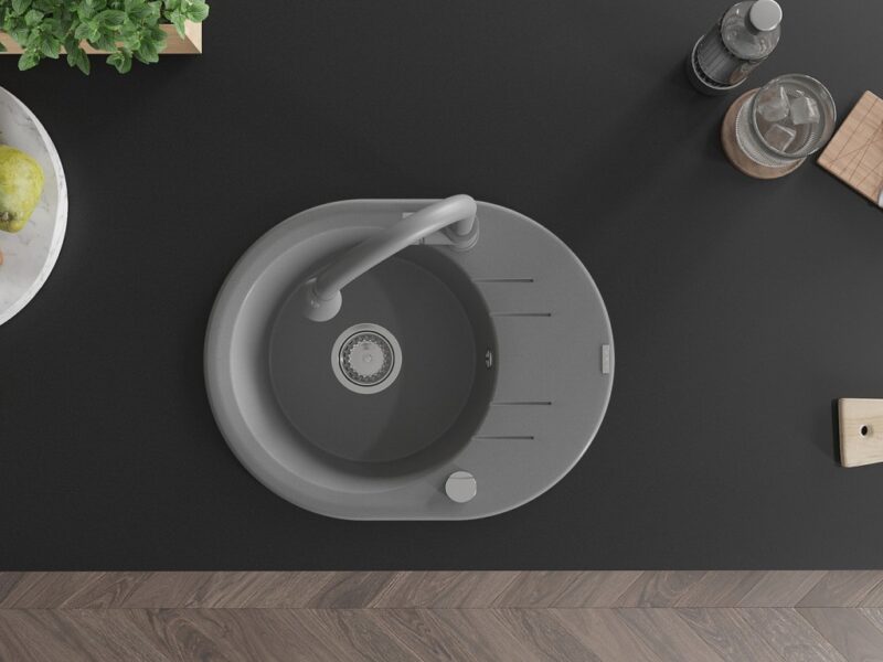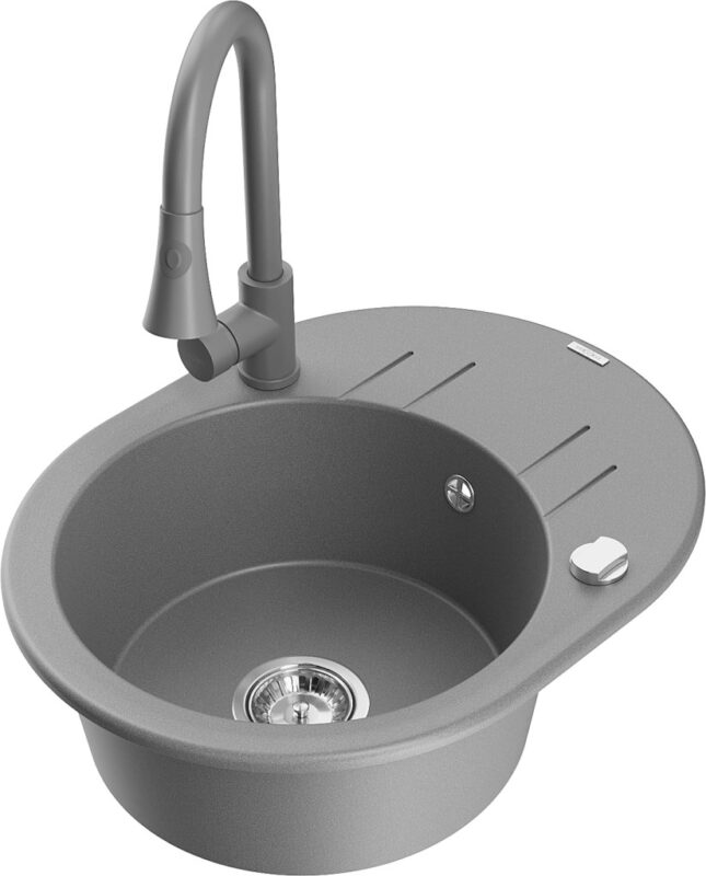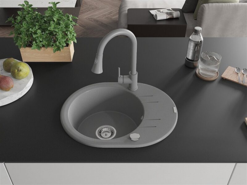Technické dáta: drez: Rozmer: 586 x 458 x 190 mm Hĺbka komory: 180 mm Šírka komory: 378×374 mm Priemer odtoku: ø90 mm Typ: 1-miska s krátkym odkvapkávačom Typ: Zapustené do pracovnej dosky Šedá farba Povrchová úprava sifónu: Chrome Materiál: žula (80% žulové kamenivo, 20% živice) Prepadový otvor: Áno Otvory: (batérie, automatické) 2 Inštalácia: Univerzálna, je možné inštalovať s odkvapkávačom na ľavú alebo pravú stranu Vysoká odolnosť proti poškriabaniu a zmene farby Odolnosť proti tepelným šokom Ľahko čistiteľný povrch Dva dodatočné vyfrézované otvory na samodierovanie ø35 kuchynská batéria: Materiál: mosadz Šedá farba Hlava: Keramická Prevzdušňovač: Áno Typ: Jedna páka Výška batérie: 380 mm Rozsah výtoku: 252 mm Typ výtoku: Výsuvný(GT) Ean: 5905315031730