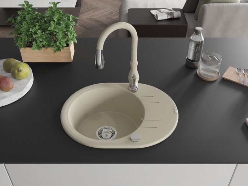 Technické dáta: drez: Rozmer: 586 x 458 x 190 mm Hĺbka komory: 180 mm Rozmery komory: 378×374 mm Priemer odtoku: ø90 mm Typ: 1-miska s krátkym odkvapkávačom Typ: Zapustené do pracovnej dosky Farba béžová Povrchová úprava sifónu: Chrome Materiál: žula (80% žulové kamenivo, 20% živice) Prepadový otvor: Áno Otvory: (batérie, automatické) 2 Inštalácia: Univerzálna, je možné inštalovať s odkvapkávačom na ľavú alebo pravú stranu Vysoká odolnosť proti poškriabaniu a zmene farby Odolnosť proti tepelným šokom Ľahko čistiteľný povrch Dva dodatočné vyfrézované otvory na samodierovanie ø35 kuchynská batéria: Materiál: mosadz Farba béžová Hlava: Keramická Prevzdušňovač: Áno Typ: Jedna páka Výška batérie: 410 mm Rozsah výtoku: 231 mm(GT) Ean: 5905315036773