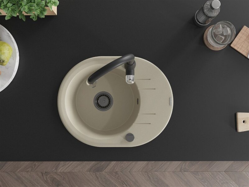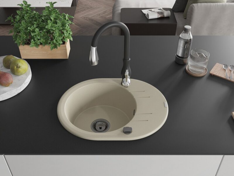 Technické dáta: drez: Rozmer: 586 x 458 x 190 mm Hĺbka komory: 180 mm Rozmery komory: 378×374 mm Priemer odtoku: ø90 mm Typ: 1-miska s krátkym odkvapkávačom Typ: Zapustené do pracovnej dosky Farba béžová Povrchová úprava sifónu: čierna Materiál: žula (80% žulové kamenivo, 20% živice) Prepadový otvor: Áno Otvory: (batérie, automatické) 2 Inštalácia: Univerzálna, je možné inštalovať s odkvapkávačom na ľavú alebo pravú stranu Vysoká odolnosť proti poškriabaniu a zmene farby Odolnosť proti tepelným šokom Ľahko čistiteľný povrch Dva dodatočné vyfrézované otvory na samodierovanie ø35 kuchynská batéria: Materiál: mosadz Čierna farba Hlava: Keramická Prevzdušňovač: Áno Typ: Jedna páka Výška batérie: 410 mm Rozsah výtoku: 231 mm(GT) Ean: 5905315036797