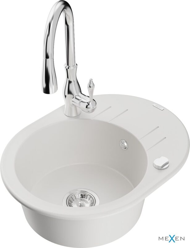 MEXEN/S MEXEN/S – Kevin granitový drez 1 s odkvapkávačom vrátane batérie Savita, biela 6517-20-672601-00